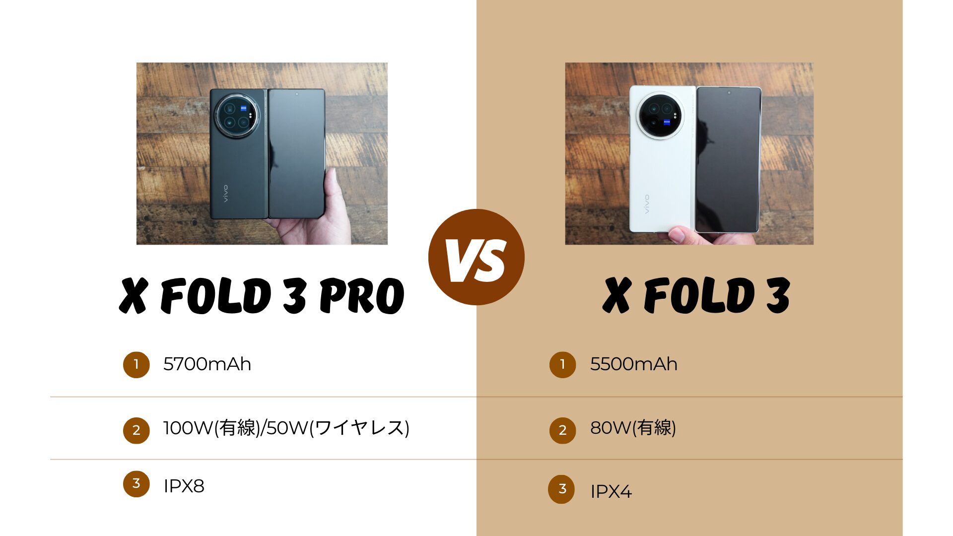 一方でvivo X Fold 3はそのデザイン性から一部スペックは異なっているので確認すると一つ目としては防水性能でvivo X Fold 3 ProはIPX8に対応していますがvivo X Fold 3はIPX4と軽い水飛沫程度であれば大丈夫ですが水に沈めたりするのは完全にNGという感じです。