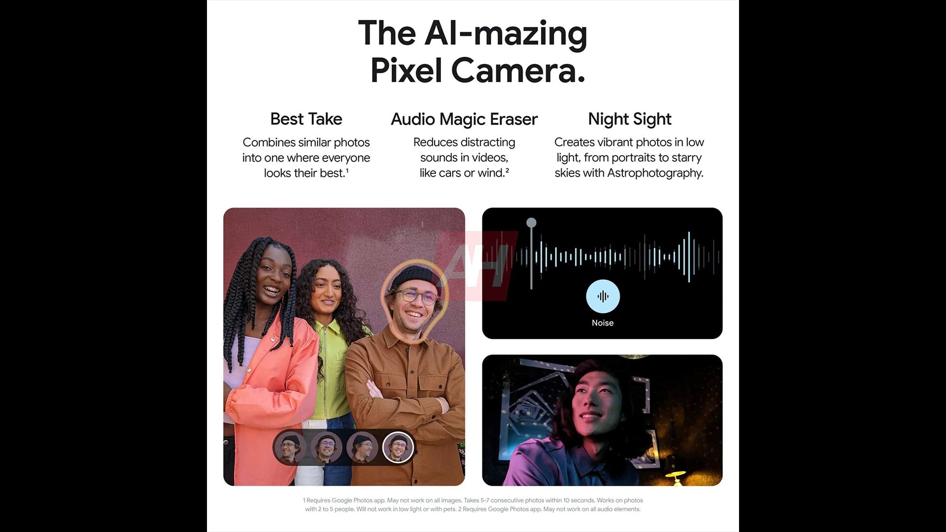 今回の情報によるとPixel 8aのマーケティング資料がリークしたことからも一部スペックが判明したとしています。上記の画像からも「AI-mazing」としてPixel 8シリーズと同じくベストテイクや音声消しゴムマジックに対応していることを確認できます。