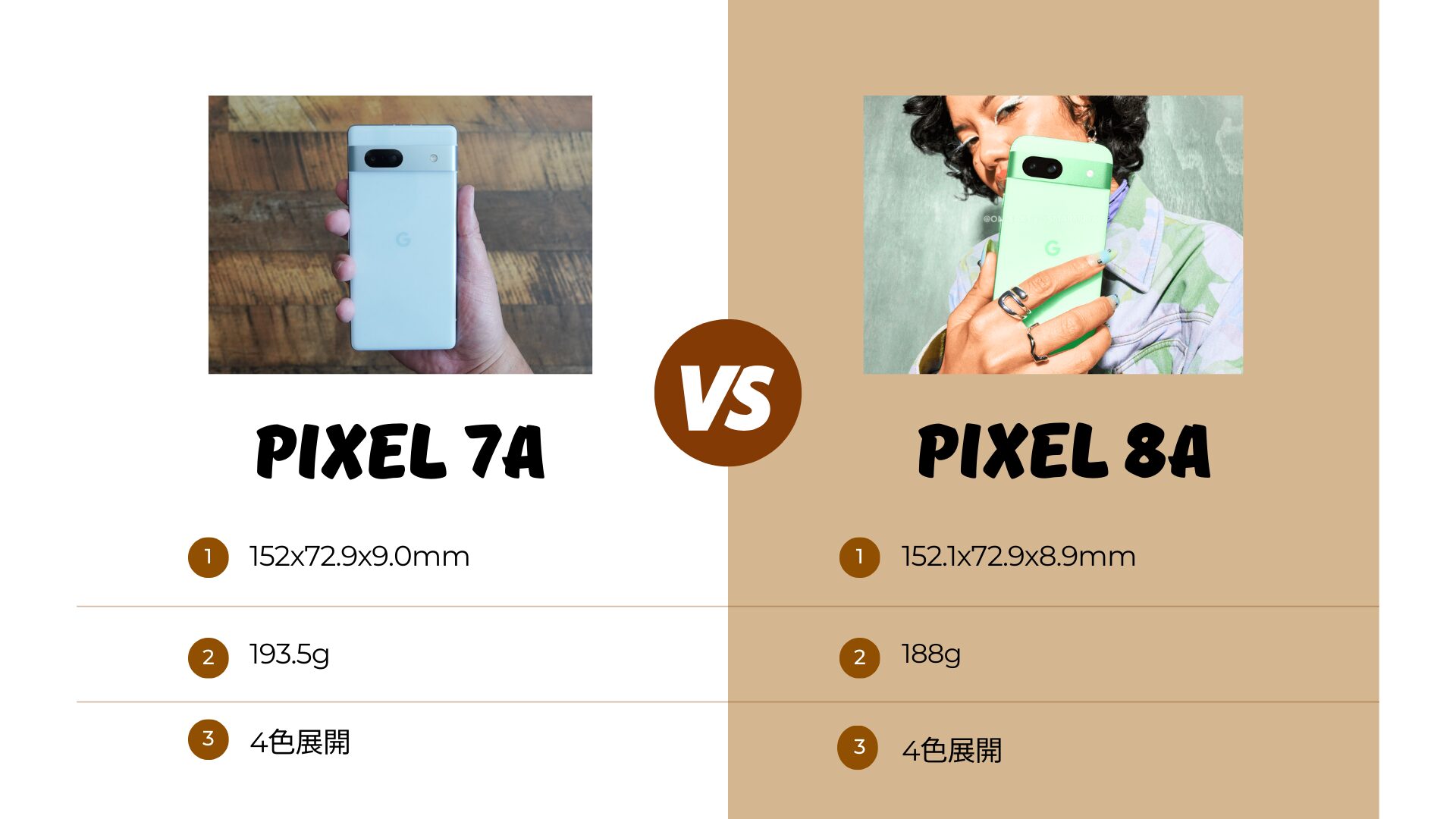 少なくともスペックだけで見ればぱっと見も持った時のサイズ感も違いが分からない程度の差。一方でaシリーズは近年のPixelの中では小型路線という感じでしたがPixel 8の方が本体の厚みはほぼ一緒とはいえ縦横が2mm程度ずつ小さいのでサイズ感優先ならPixel 8です。