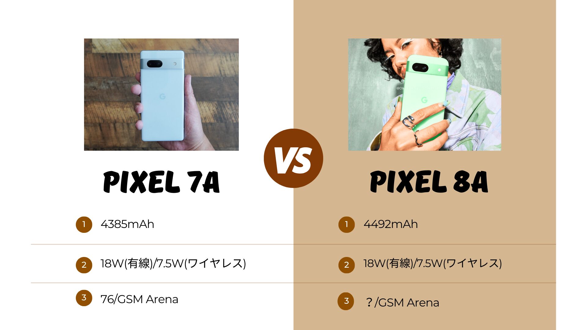 そして有線の場合は最大で18Wでワイヤレス充電は7.5Wと残念なことに充電速度に進化はない。そのためバッテリー容量が増えた分Pixel 8aの方が僅かですが充電速度は遅くなる可能性も。