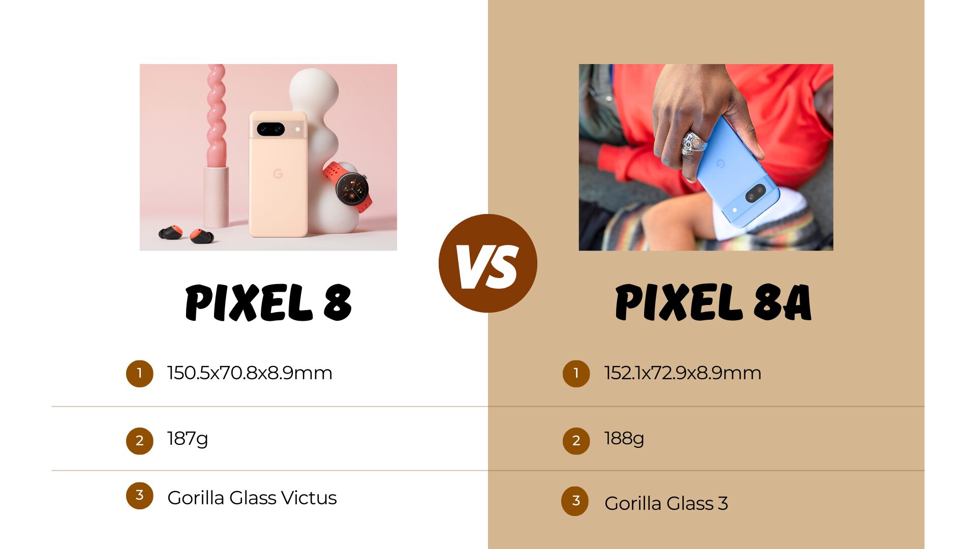 一方でPixel 8はバックパネルにGorilla Glass Vicutsを採用しているので耐久性に違い。結局ケースをつければ関係ないですがPixel 8aの方は耐久性を考えるとつけた方がいいです。