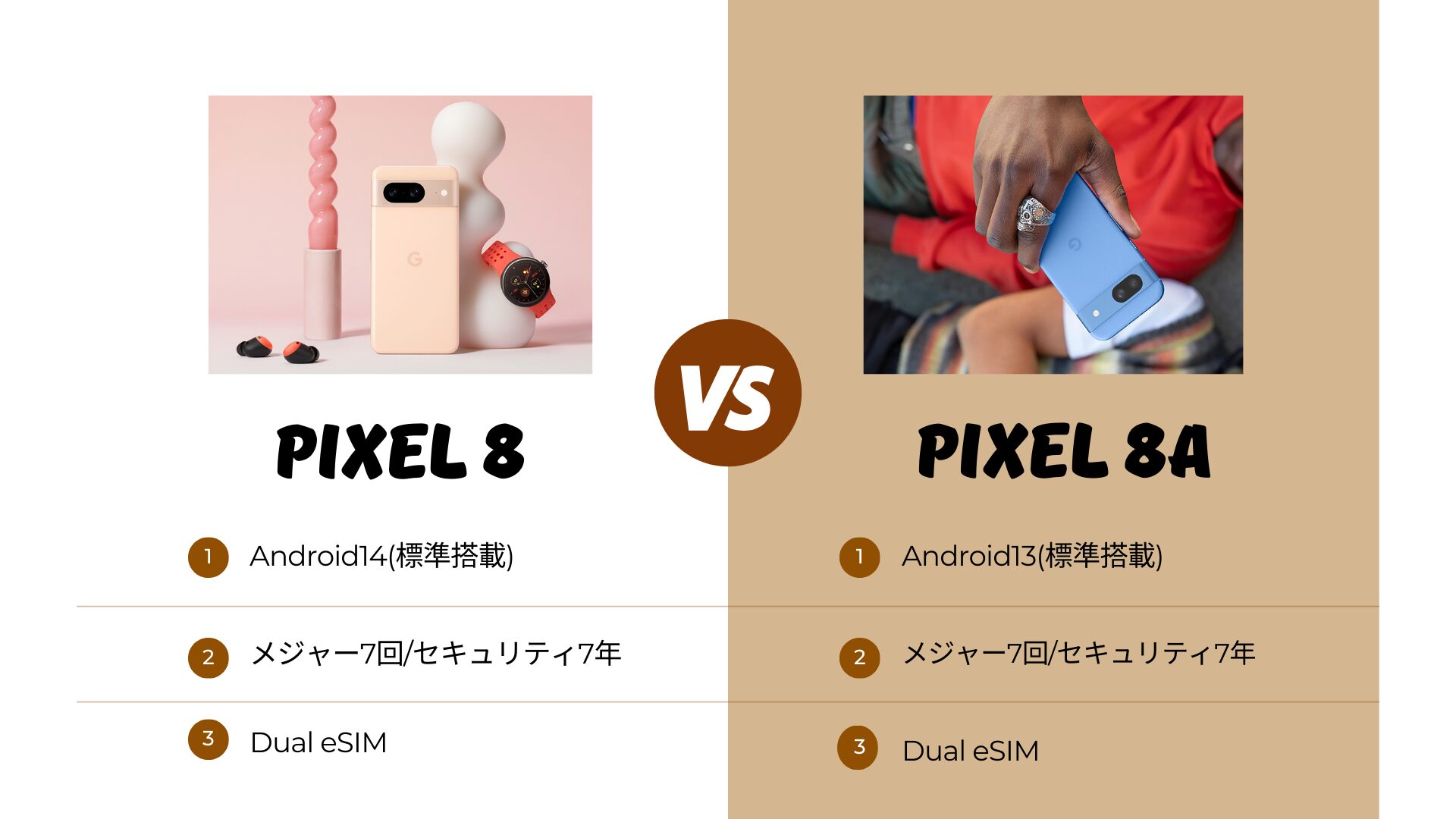 ただフラッグシップとaシリーズということもあり差別化してきてもおかしくないです。最大7年というアップデートに対応したことで未来のアップデートに期待したいならPixel 8です。