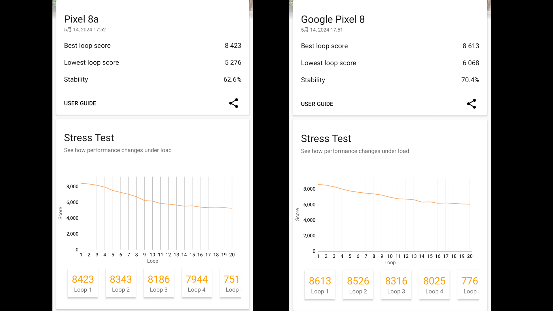 また廉価版としてみた時にPixel 8aの安定率62.6%はちょっと寂しいかなという感じです。Pixel 8aの最適化が終了していない状態でベンチマークをかけているので今後様子見が必要。