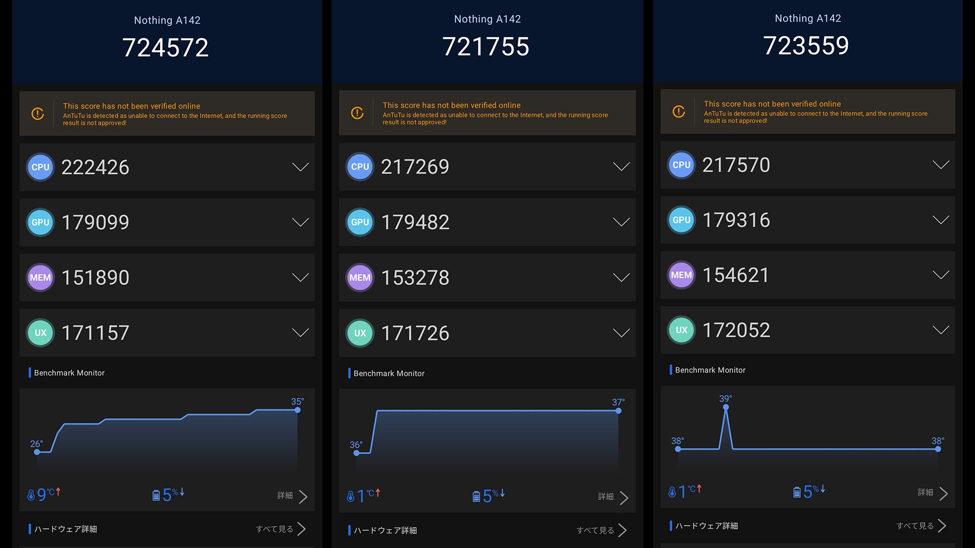 そしてNothing Phone(2a)はDimensity7200 ProでPixel 8aはGoogle Tensor G3を搭載しています。とりあえず発熱の程度を調べるためにベンチマークを3回連続で回してみました。