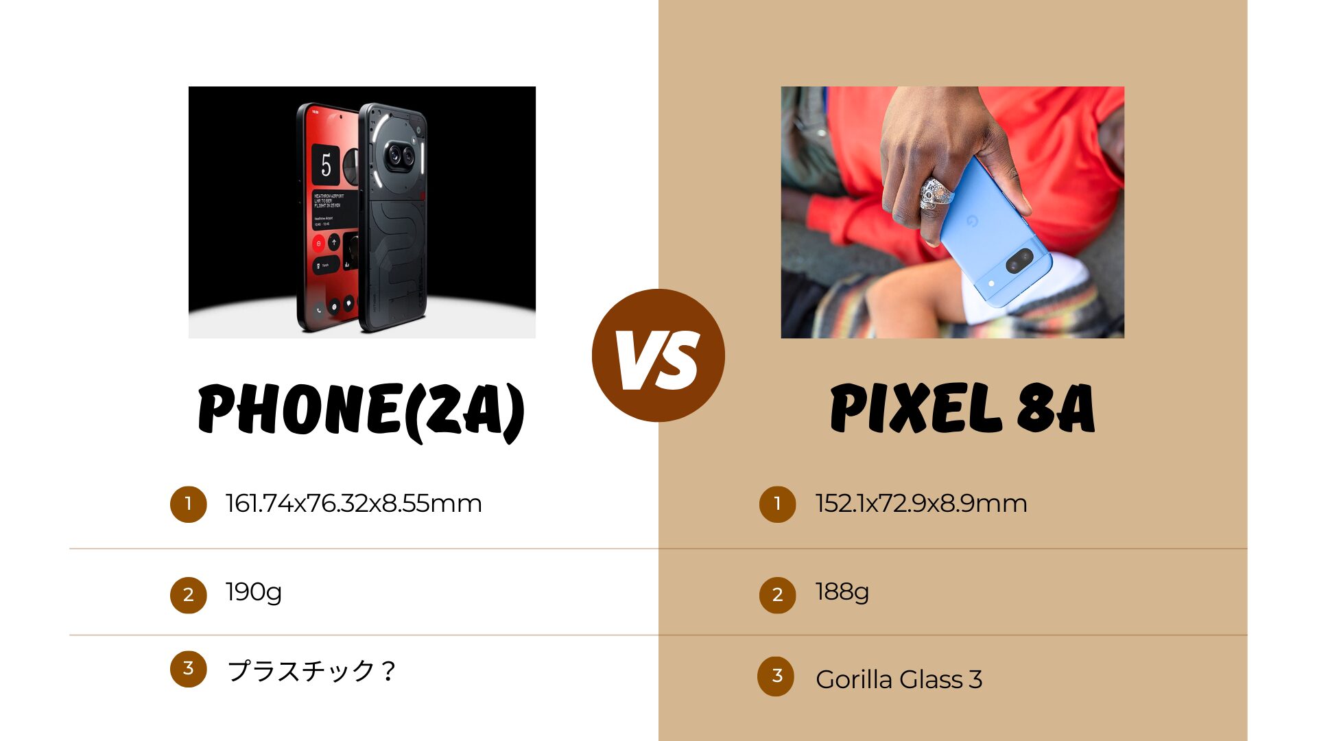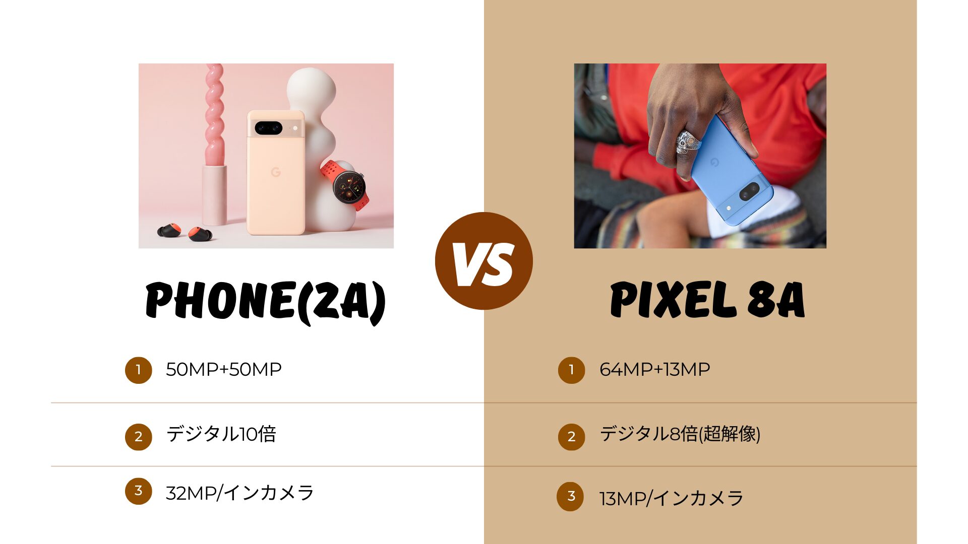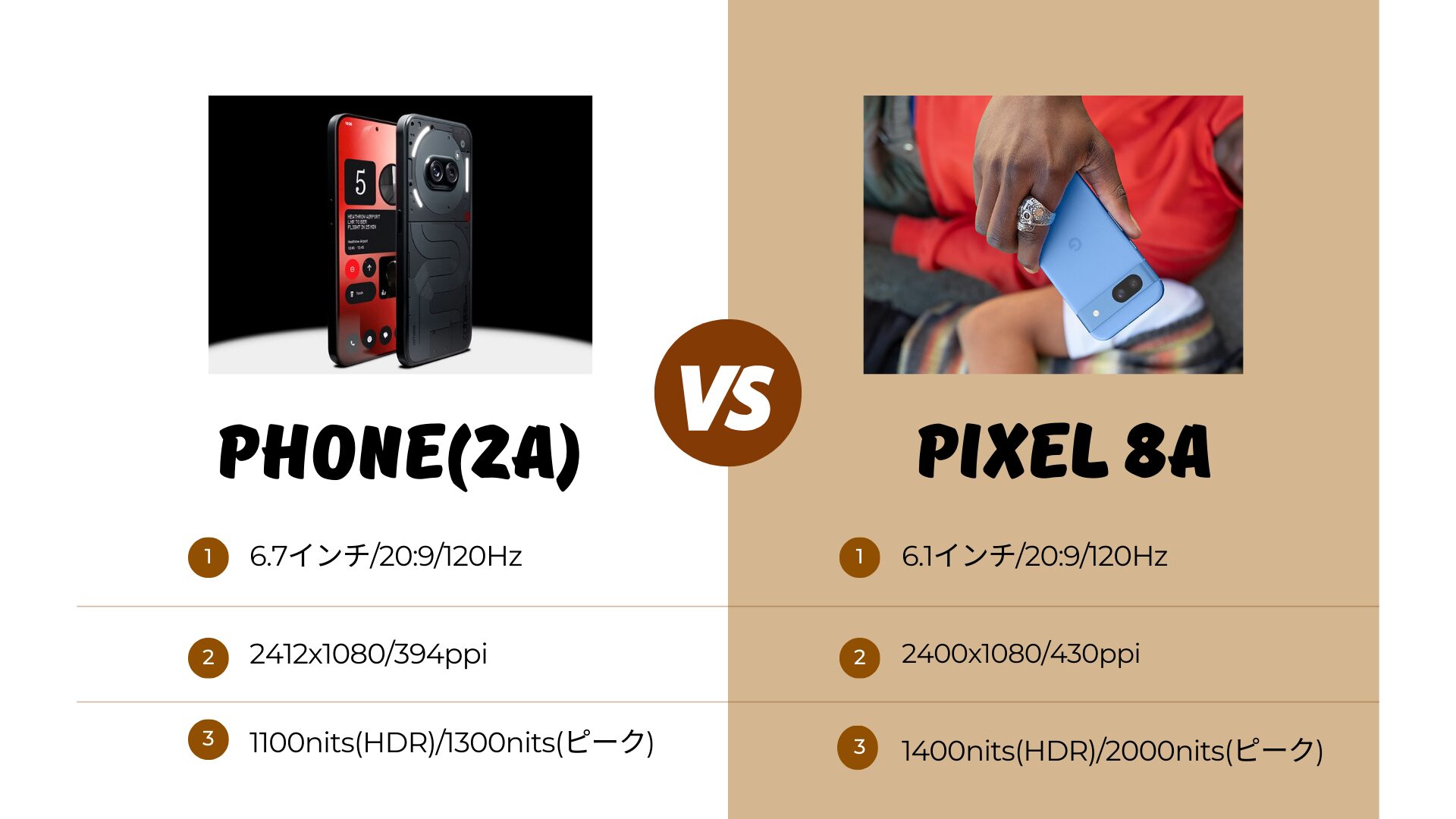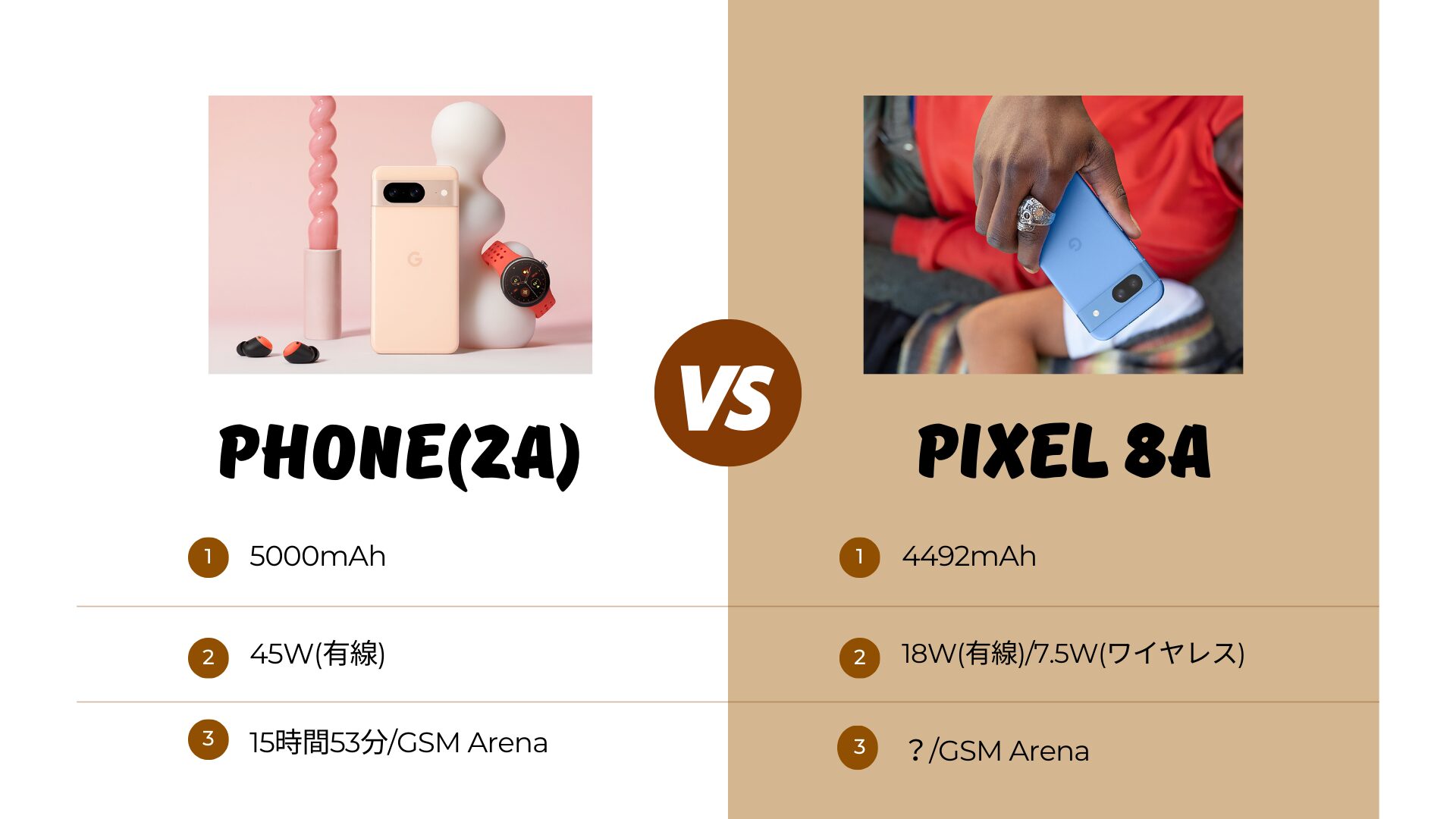 今回はコスパ機種として注目度が高いGoogle Pixel 8aとNothing Phone(2a)の比較レビューを主観的にまとめたいと思います。