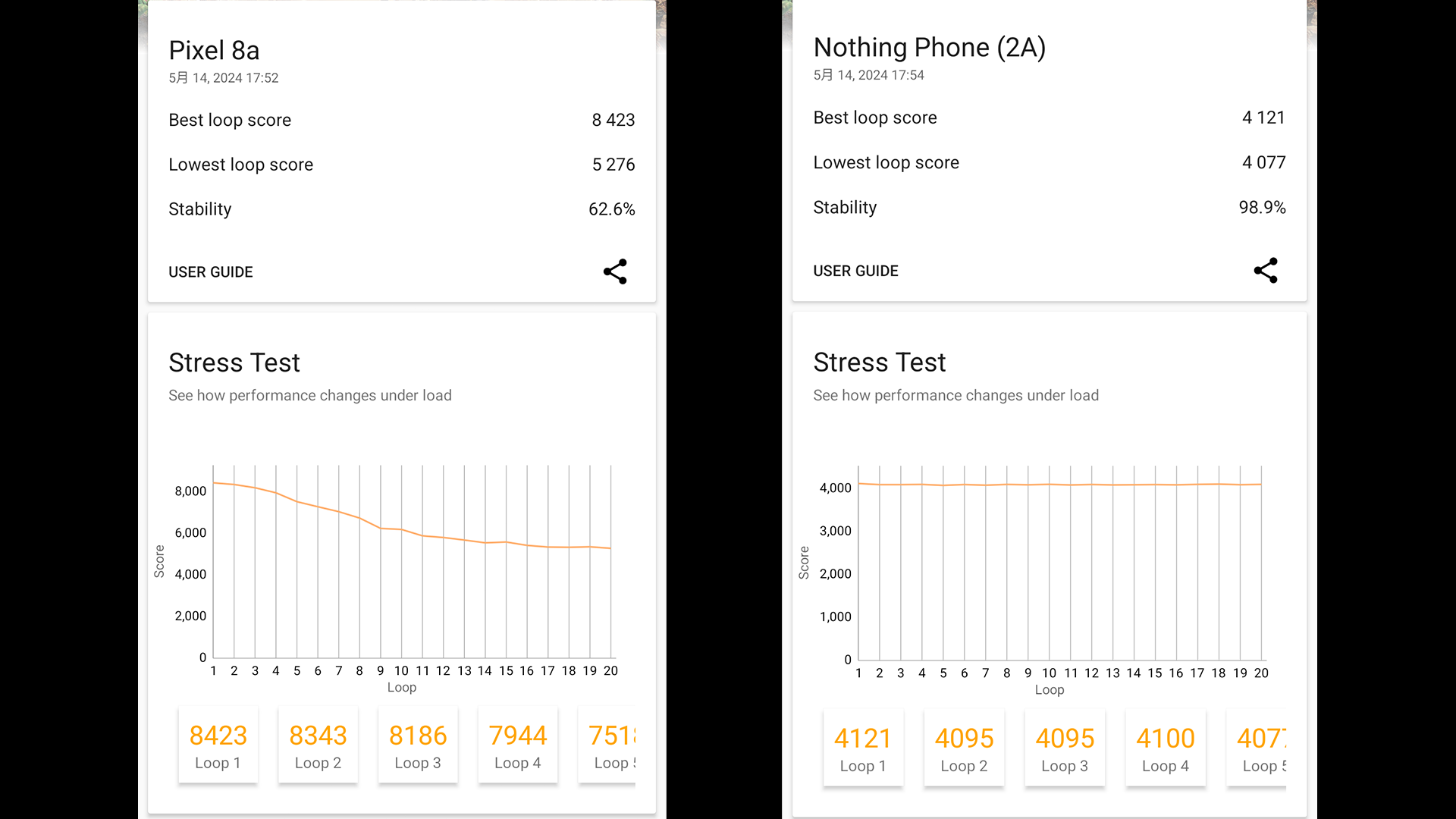 今回比較した感じだと価格が高い分もありPixel 8aの方が全体的に安定している印象を受ける。やはりNothing Phone(2a)はスペックで分からない部分で上手くコストカットしています。