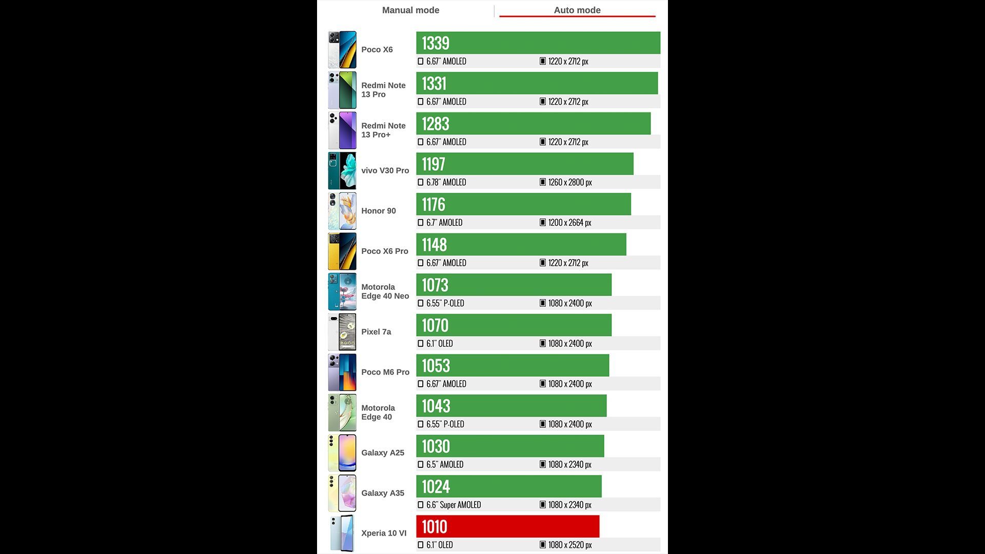 ちなみにXperia 10Ⅴは手動調節で624nitsで自動調節で947nitsなのでほとんど変わらずです。他社と比較した場合手動調節は割と明るい方ですが自動調節は中間という感じの結果です。