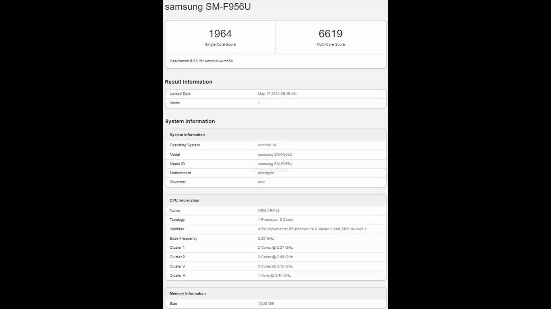 今回の情報によるとSamsungの未発表機種である「SM-F956U」のベンチマークが判明したとしています。SM-F956UはGalaxy Z Fold 6/アメリカ版とされており、ベンチマークを確認するとAndroid14を標準搭載。