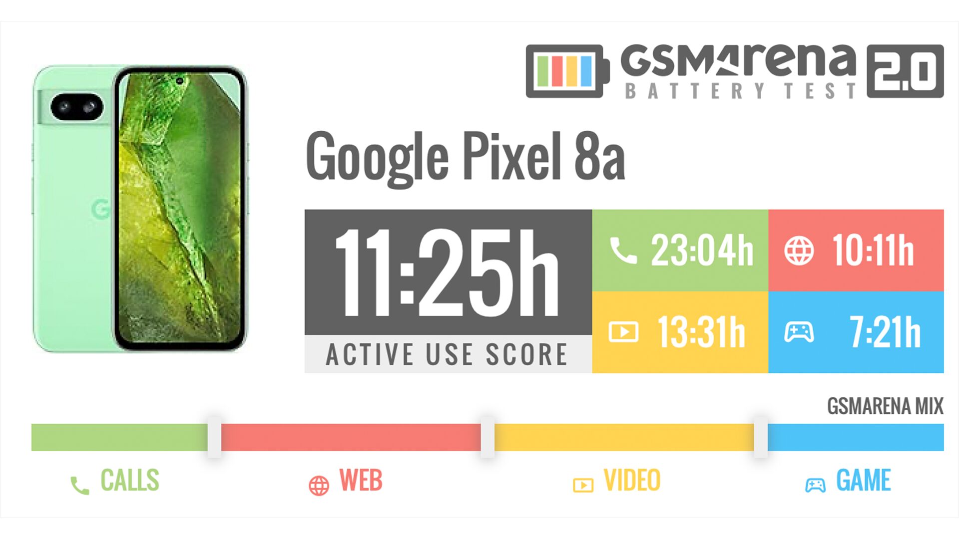 執筆時点において同サイトはGoogle Pixel 8aの詳細なレビュー記事を公開していませんが、今回バッテリーテストの結果のみ先に公開していることが判明しました。まず上記の画像からも11時間25分であることからも電池持ちは良くないです。