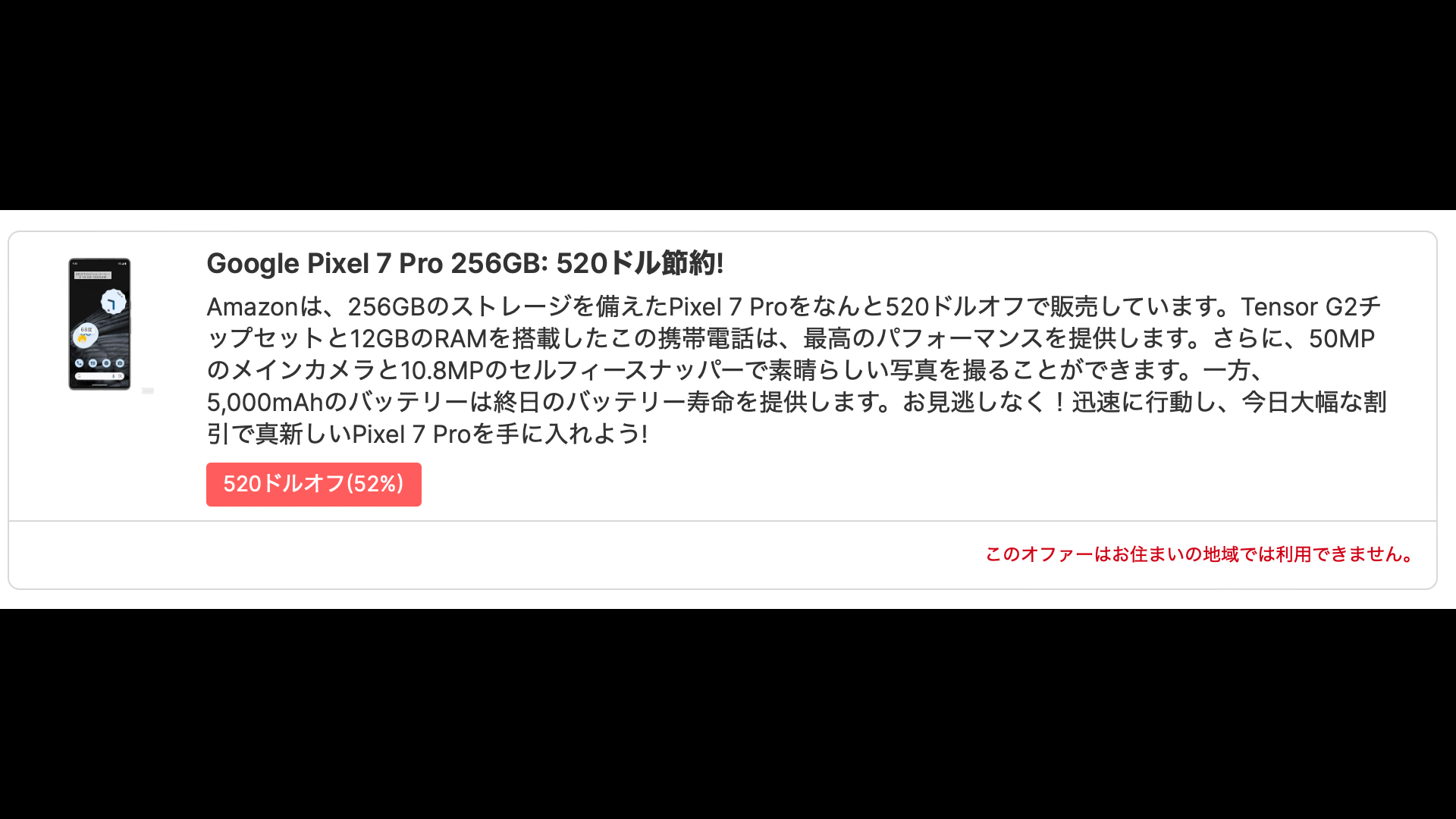 今回の情報によると米AmazonにおいてGoogle Pixel 7 Proが$520の値引きで購入することが可能であることが判明してたとしてます。値引率としては52%なので半額以下の価格設定となっています。