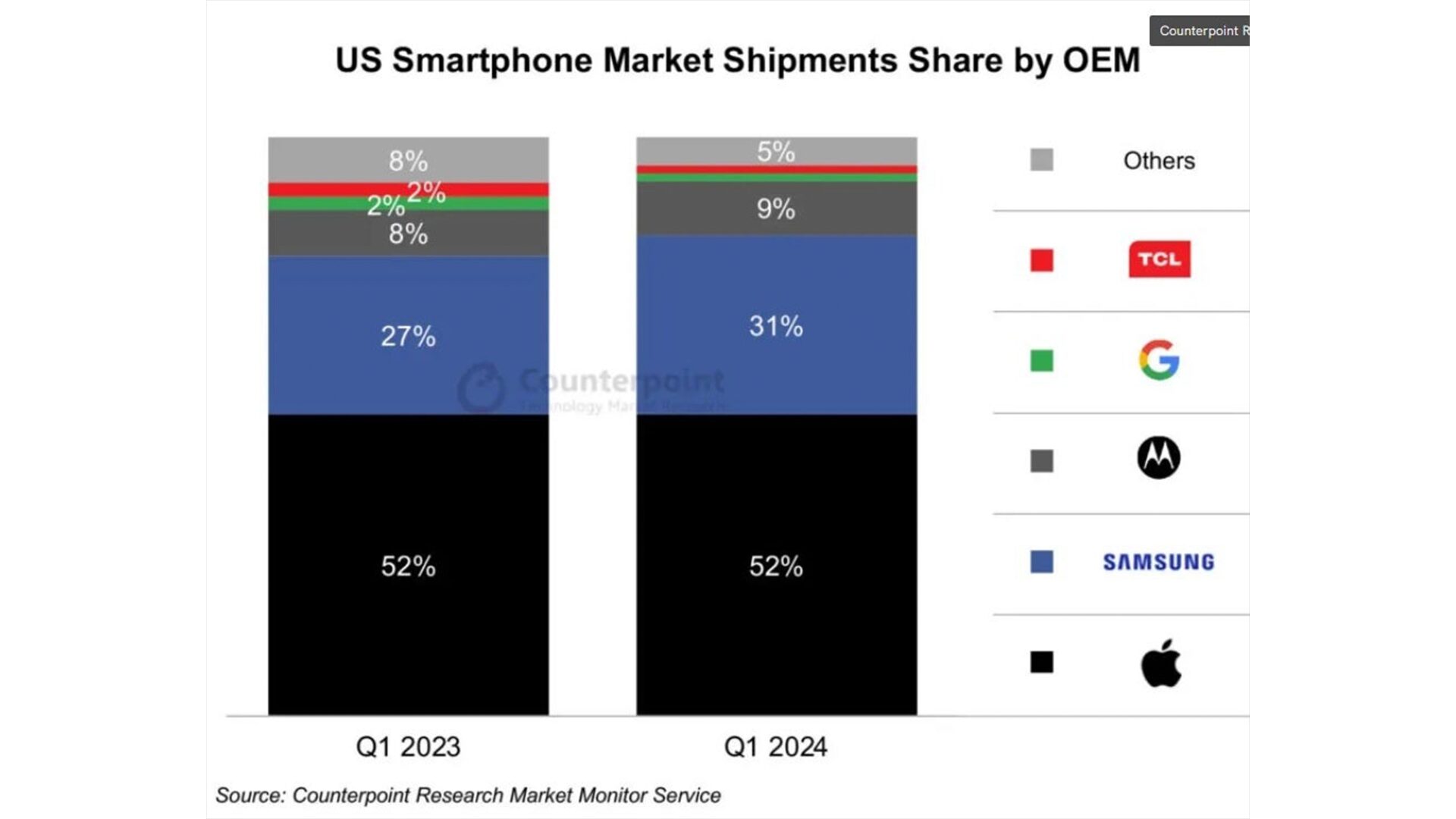 今回市場調査会社が2024年第1四半期メーカー別シェアの調査結果を公開したことが判明しました。相変わらずAppleが52%とシェア1位を獲得した一方で前年対比でみると現状維持になっています。