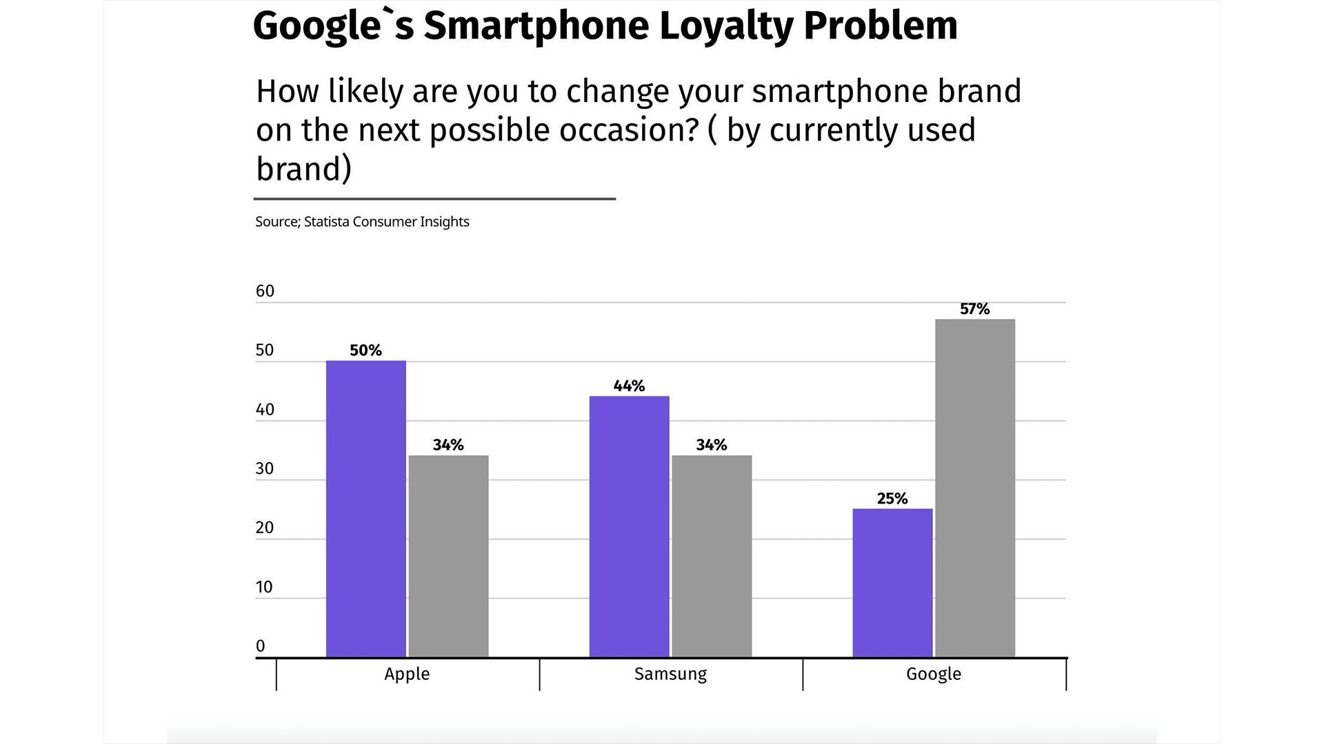 シェアが世界で見てもトップクラスのAppleやSamsungと比較するとかなり劣って見えます。何よりGoogleは既存ユーザーを満足させられるような製品を提供出来ないていないことが浮き彫りになった感じで前回見た調査の時よりも数字がさらに悪化している印象を受けます。