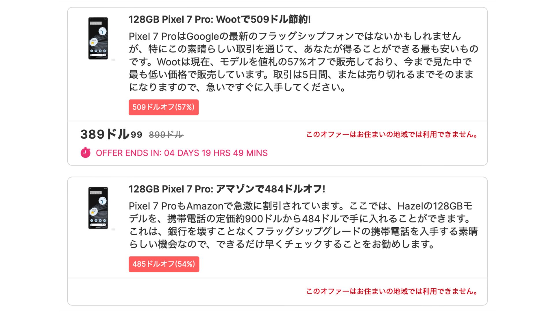 今回期間限定となりますが米WootにおいてGoogle Pixel 7 Proの128GBモデルが$509オフで販売されていることが判明したとしています。上記の画像からも今回のセールは57%オフでまさかの$389で購入することが可能となっています。