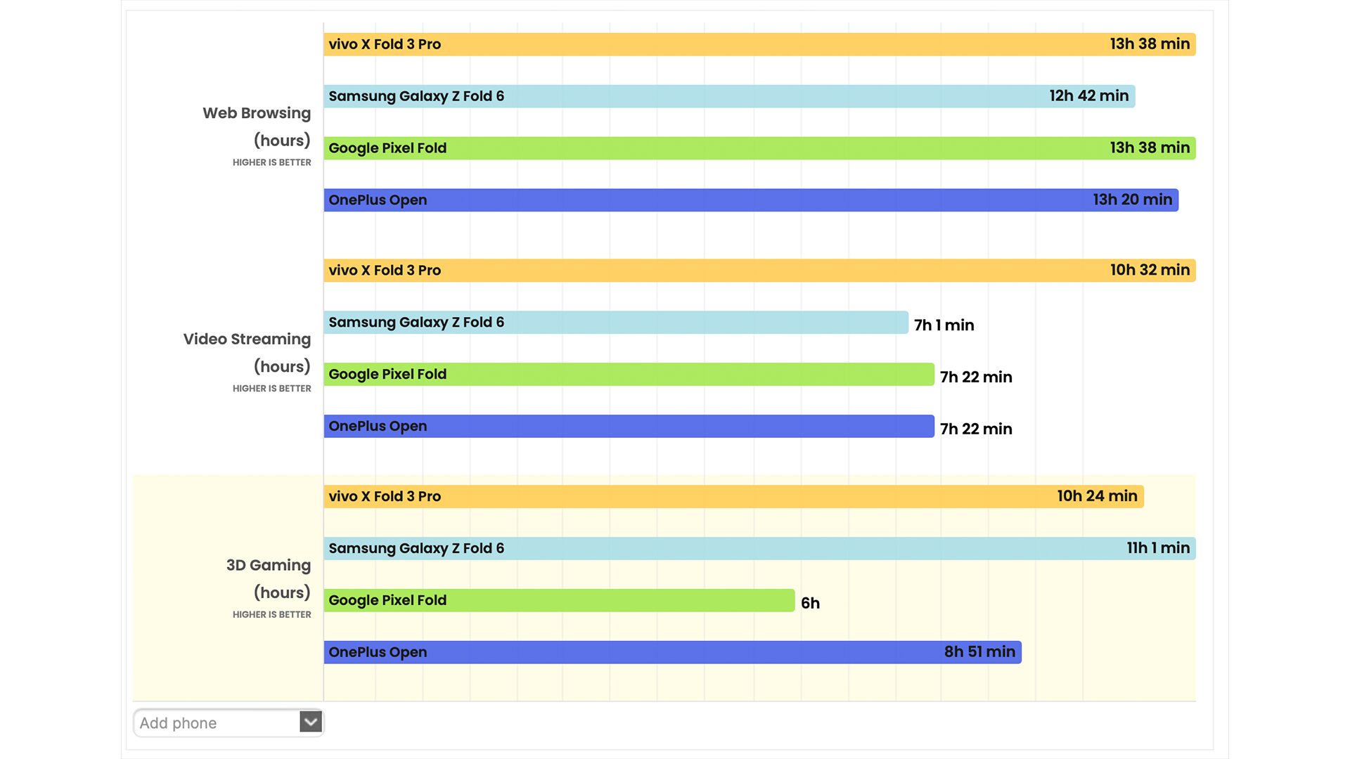 あくまでも今回の比較項目でみるとゲームプレイ時間だけGalaxy Z Fold 6に劣る感じ。あとはトップクラスで特にビデオ再生時間はダントツという感じです。実際に使っていて思いますが電池持ちはスペックの割には優秀という印象はないです。