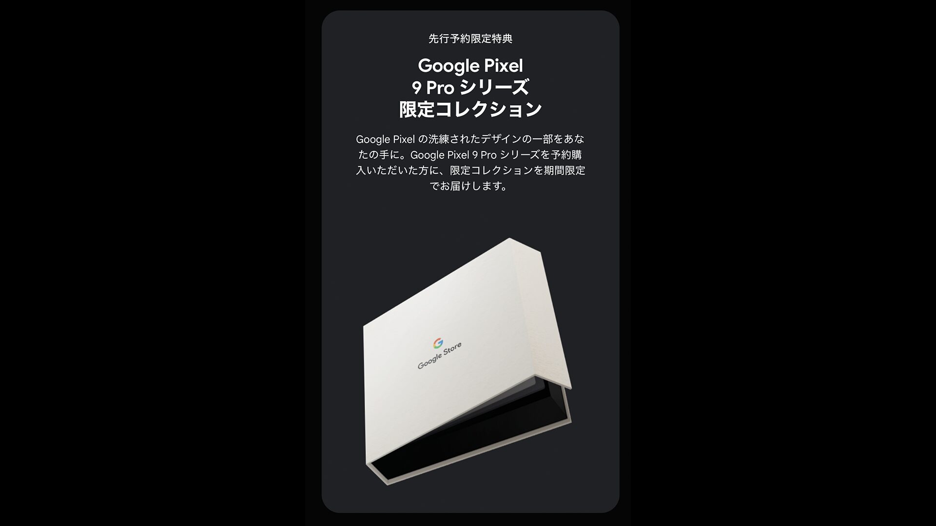 まず一つ目としてPixel 9 Proシリーズを購入することで限定コレクションが貰えることです。基本Google Storeにおいて予約/購入特典としては機種には差はあれどストアクレジットに下取りが期間限定で強化されるという感じで何か予約したら貰えるという感じではありません。