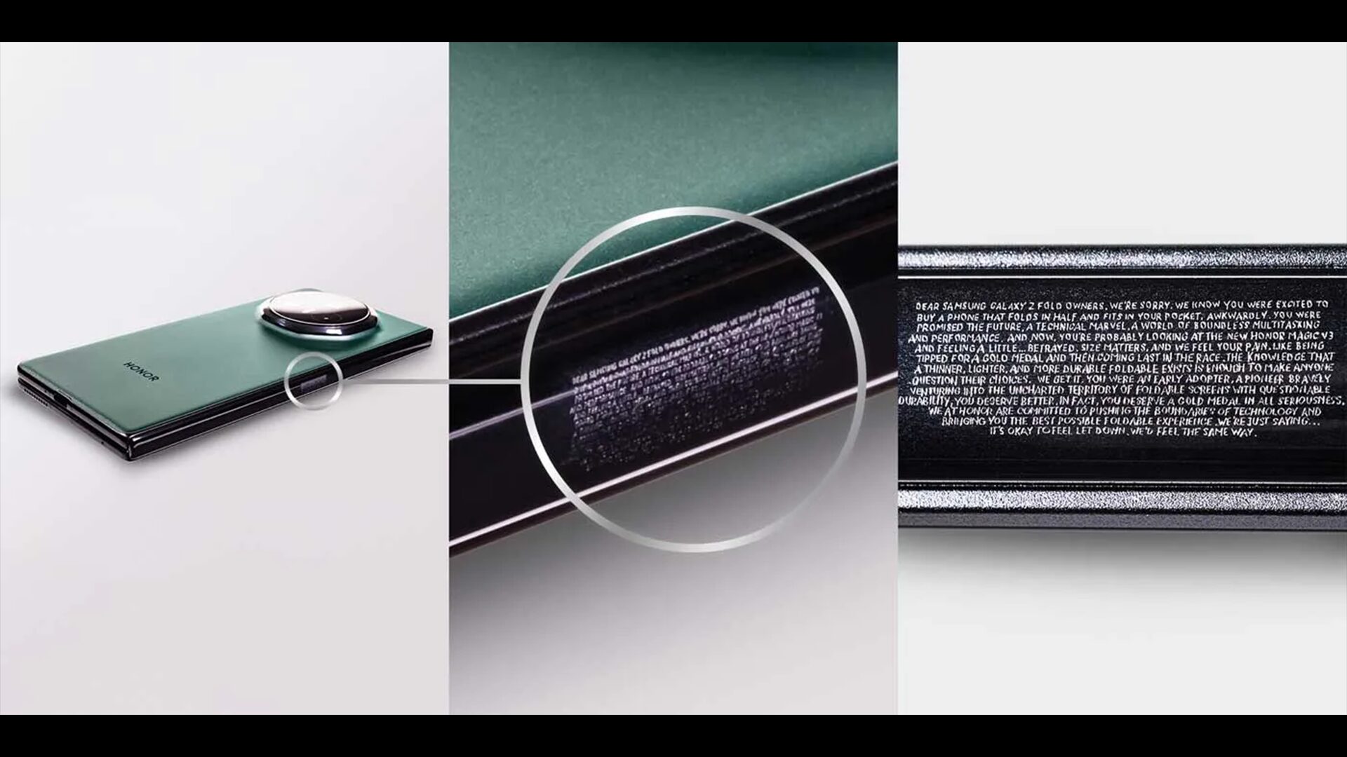今回の情報によると「HONOR Magic V3」のヒンジ部分にあるメッセージが刻印されていることが判明しており以下のようになります。