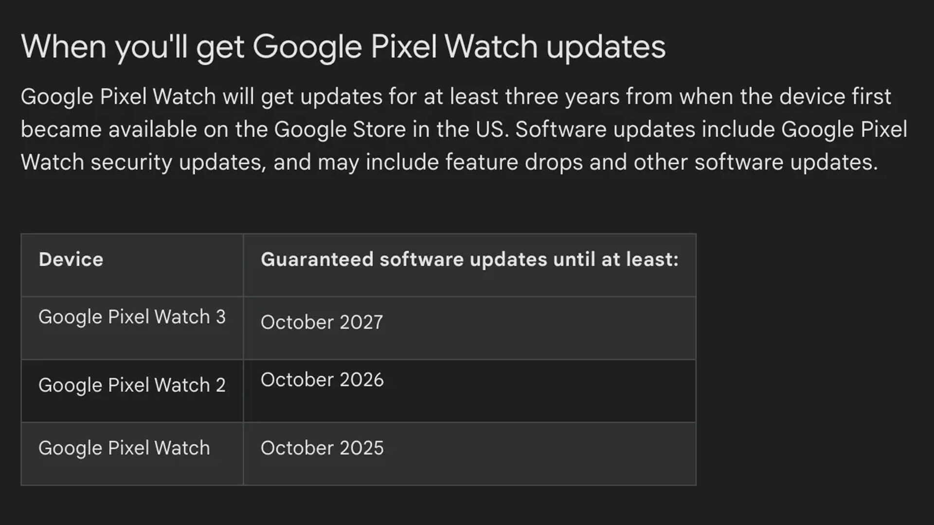 今回の情報によると「Google Pixel Watch 3シリーズ」は2027年10月までのアップデートサポートに対応していることが判明したとしています。上記の画像からもPixel Watch 3シリーズは初代と同じく最大3年のアップデートサポート期間に対応していることになります。