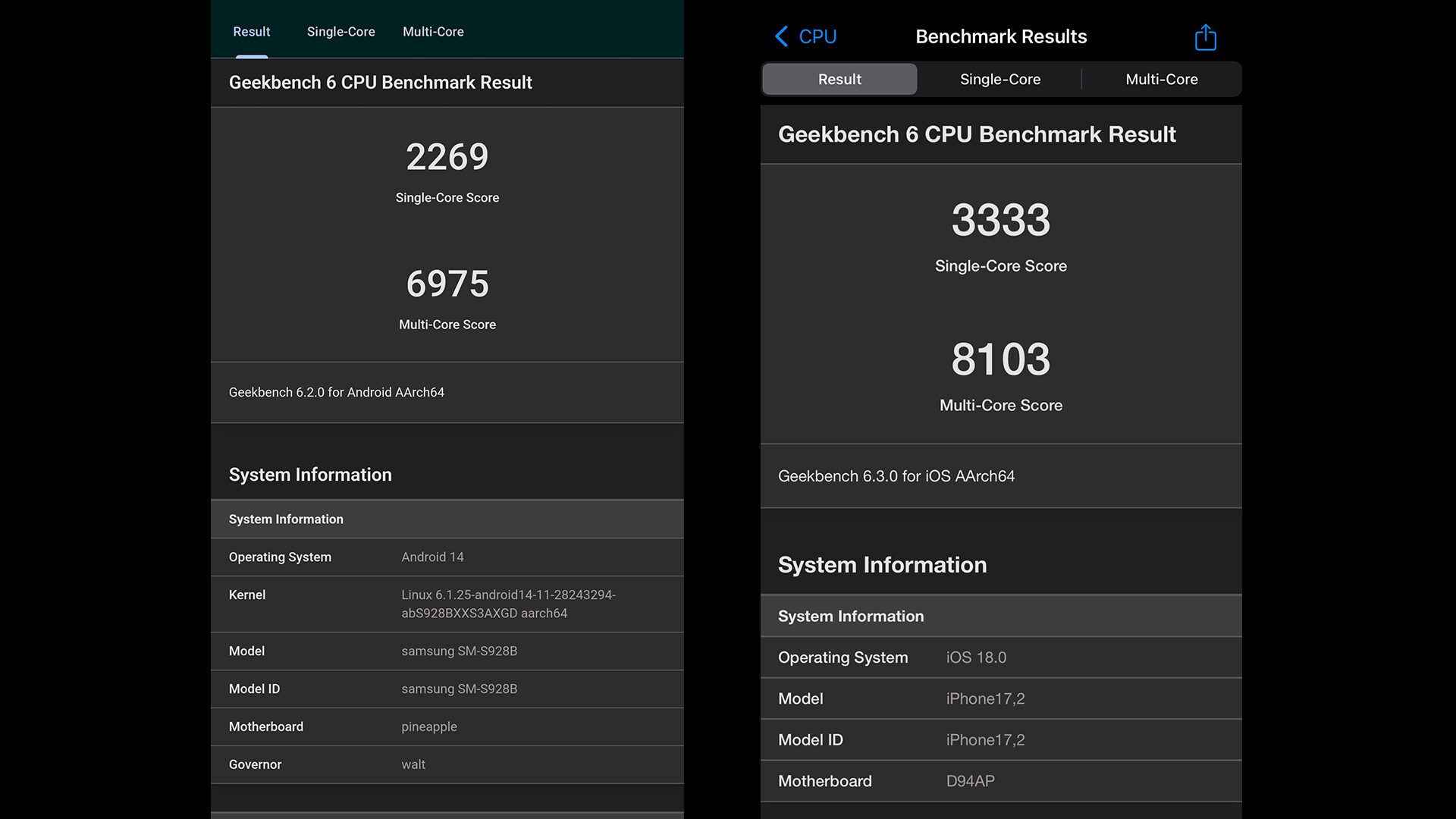 ちなみに上記の画像は手持ちのiPhone 16 Pro MaxとGalaxy S24 Ultraでの計測結果となっています。iPhone 16 Proシリーズはマルチコアが9000はいかない感じなので、今回の情報通りであればSnapdragon 8 Gen 4の方がスコアは高いかもしれません。