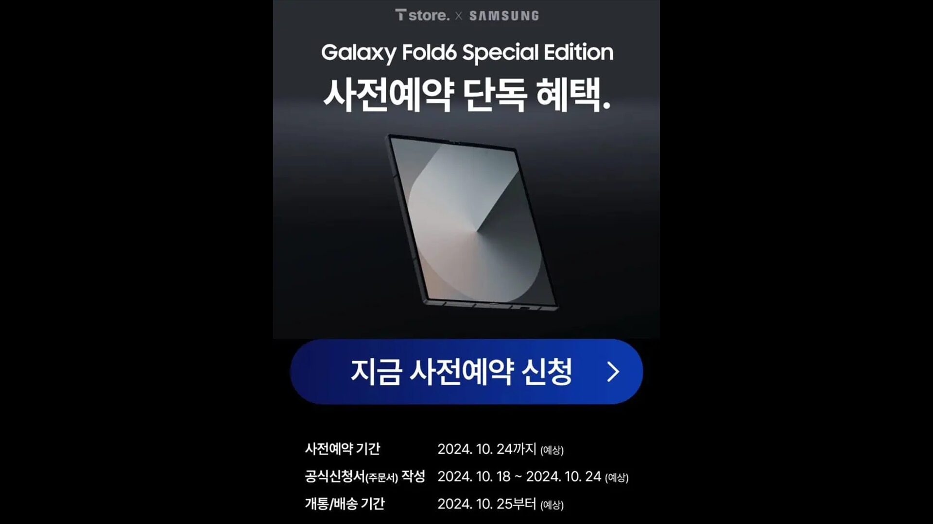 上記の画像からも予約期間は10月18日に予約が開始して10月25日より発売になっていることを確認できます。一方で事前情報と異なる部分として製品名称が「Galaxy Z Fold 6 Special Edition」とされており、なんか本物なのかフェイクなのかよく分からないという感じです。