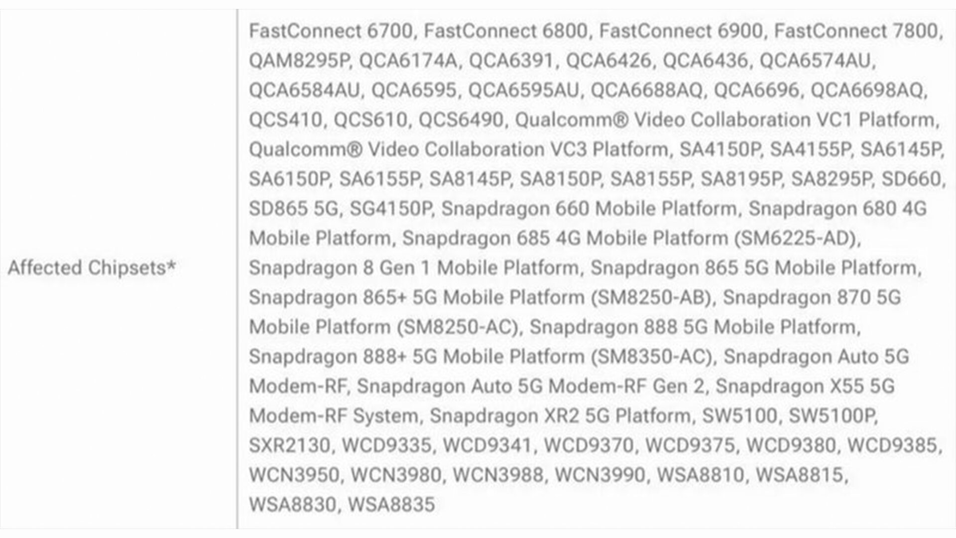 そして今回のセキュリティ上のリスクを抱えたSnapdragonのチップが上記の画像になります。最新機種であればいずれアップデートが配信されると思いますが、上記の画像を見るとSnapdragon865など古いSoCも含まれていることです。