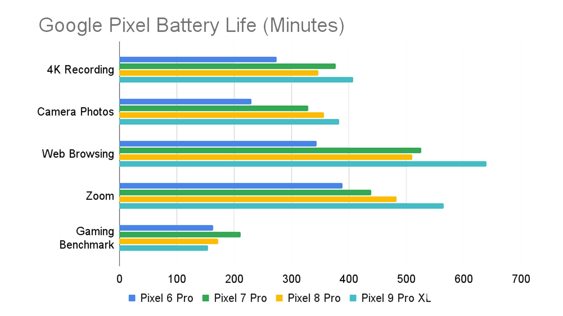 大きく5つの項目でバッテリーテストを行なっていますがゲーム以外に関してPixel 9 Pro XLは電池持ちが改善傾向にあることを確認できます。特にウェブブラウジングとズームに関しては他の機種と大きな差があります。