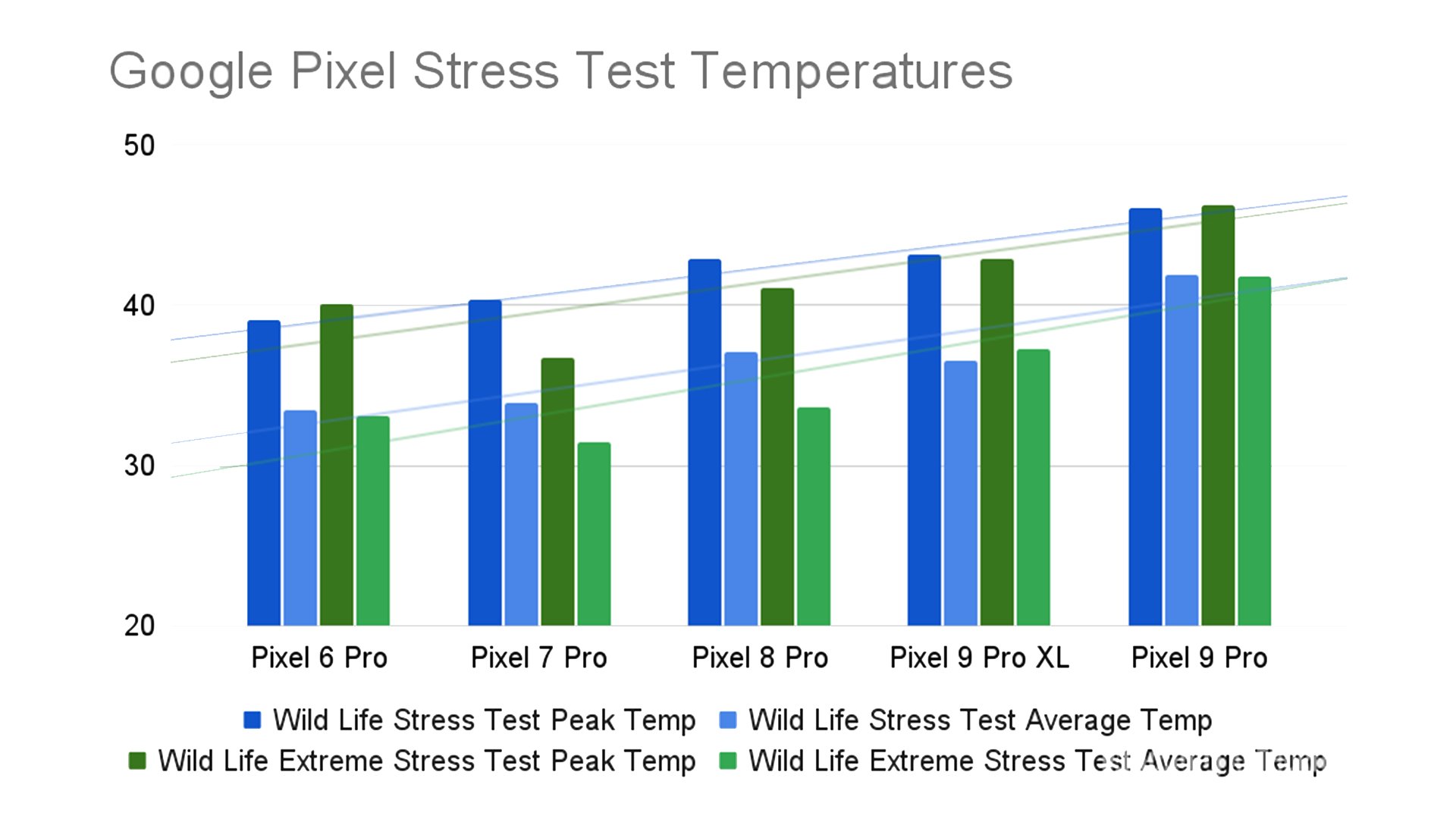 約20分間のテストになりますが、散々発熱がひどいと言われたPixel 6 Proの最高温度が40.1度に対してPixel 9 Pro XLは43.2度になったとしています。また平均温度に関してもPixel 6 ProよりPixel 9 Pro XLの方が高いことを確認することが出来ます。