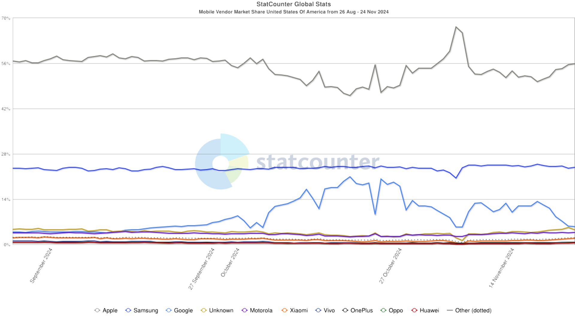 今回Statcounterがアメリカ市場における「Webトラフィック」を元にメーカー別のシェアの統計結果を公開していることが判明しました。上記の画像からも9月1日頃は特段動きはないですが9月27日頃からPixelのシェアが徐々に拡大しています。
