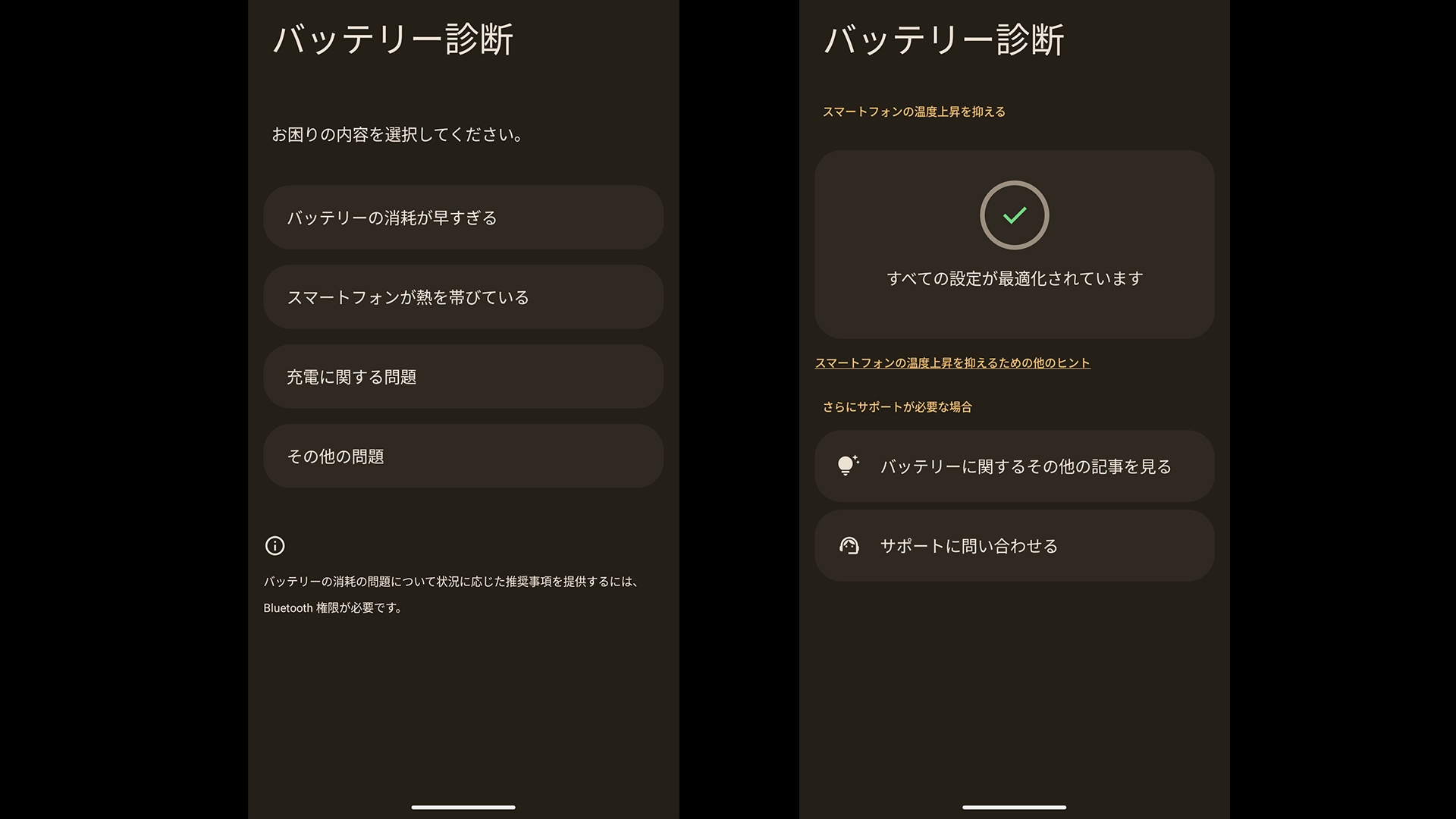 また確認方法として設定/バッテリー/バッテリー診断とタップすることでバッテリーの状態を確認することができます。ちなみに海外サイトによるとデバイス温度に関するメッセージは以下のようになります。