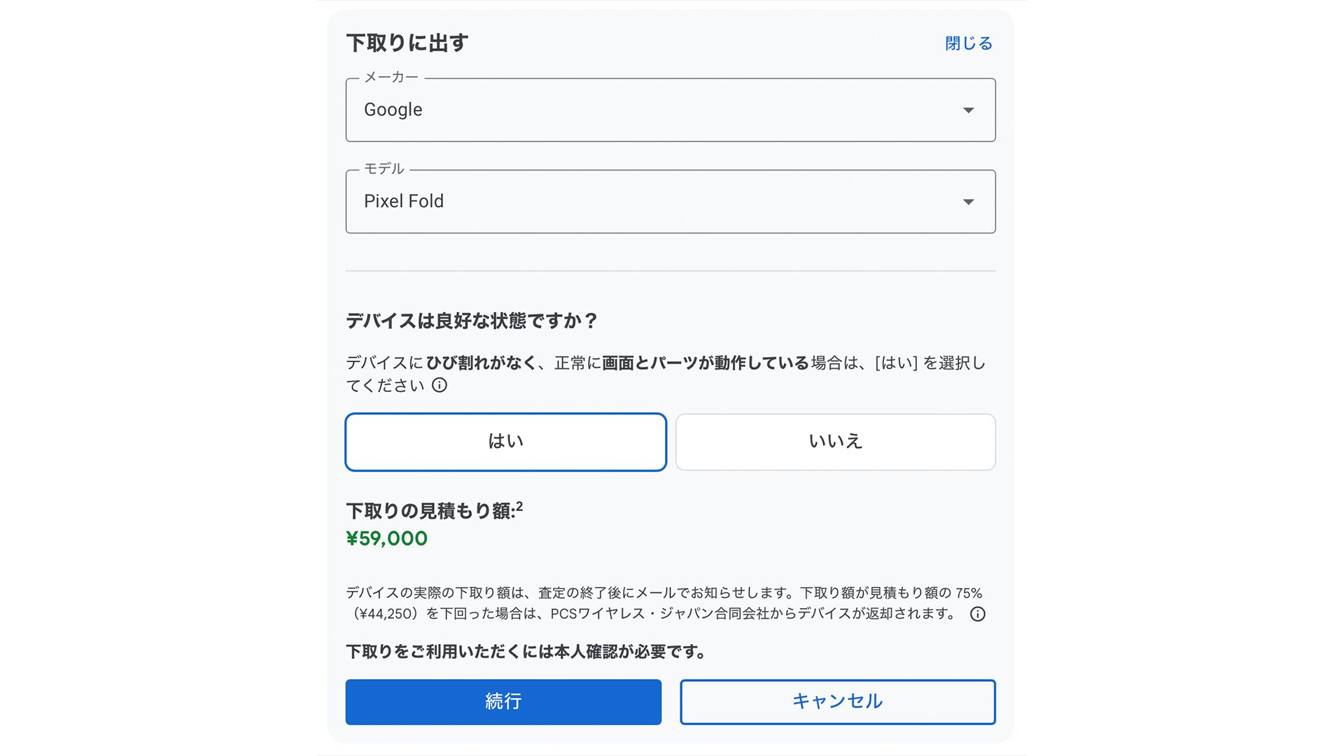 なので結果的には新品を購入しましたが、今度は故障気味のPixel Foldの処分に困っていました。なのでPixel 9 Pro Foldへの買い換えの際に下取りに出してみました。予約期間内に購入したことからも、その当時Pixel Foldは最大10万円でしたが、驚くことに10万円の満額査定を貰えました。