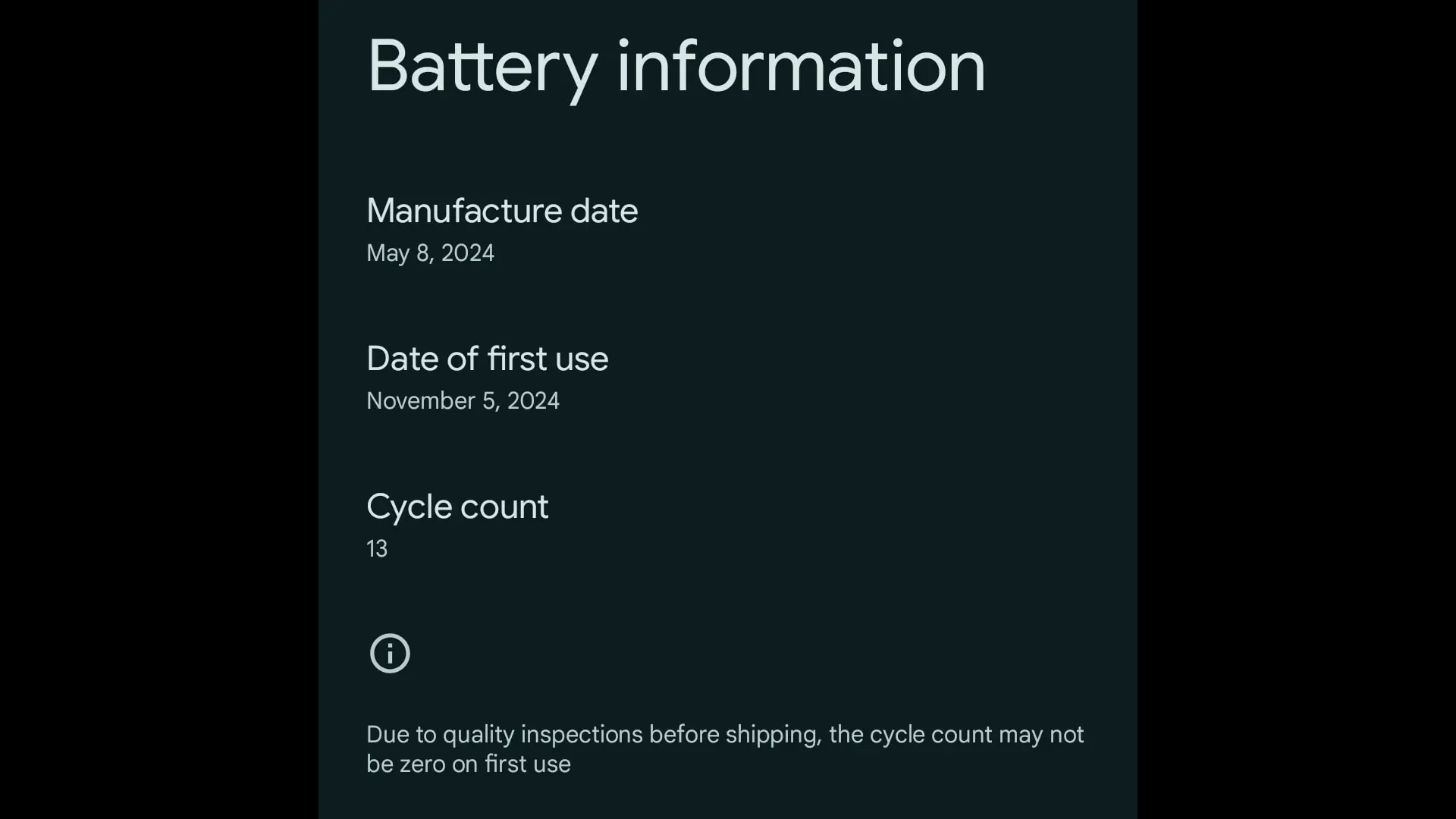 そうすると上からバッテリーの製造日/初回使用日/サイクル回数を確認することが出来ます。ちなみに出荷前の品質検査からサイクル回数がゼロになっていない可能性があるとしています。