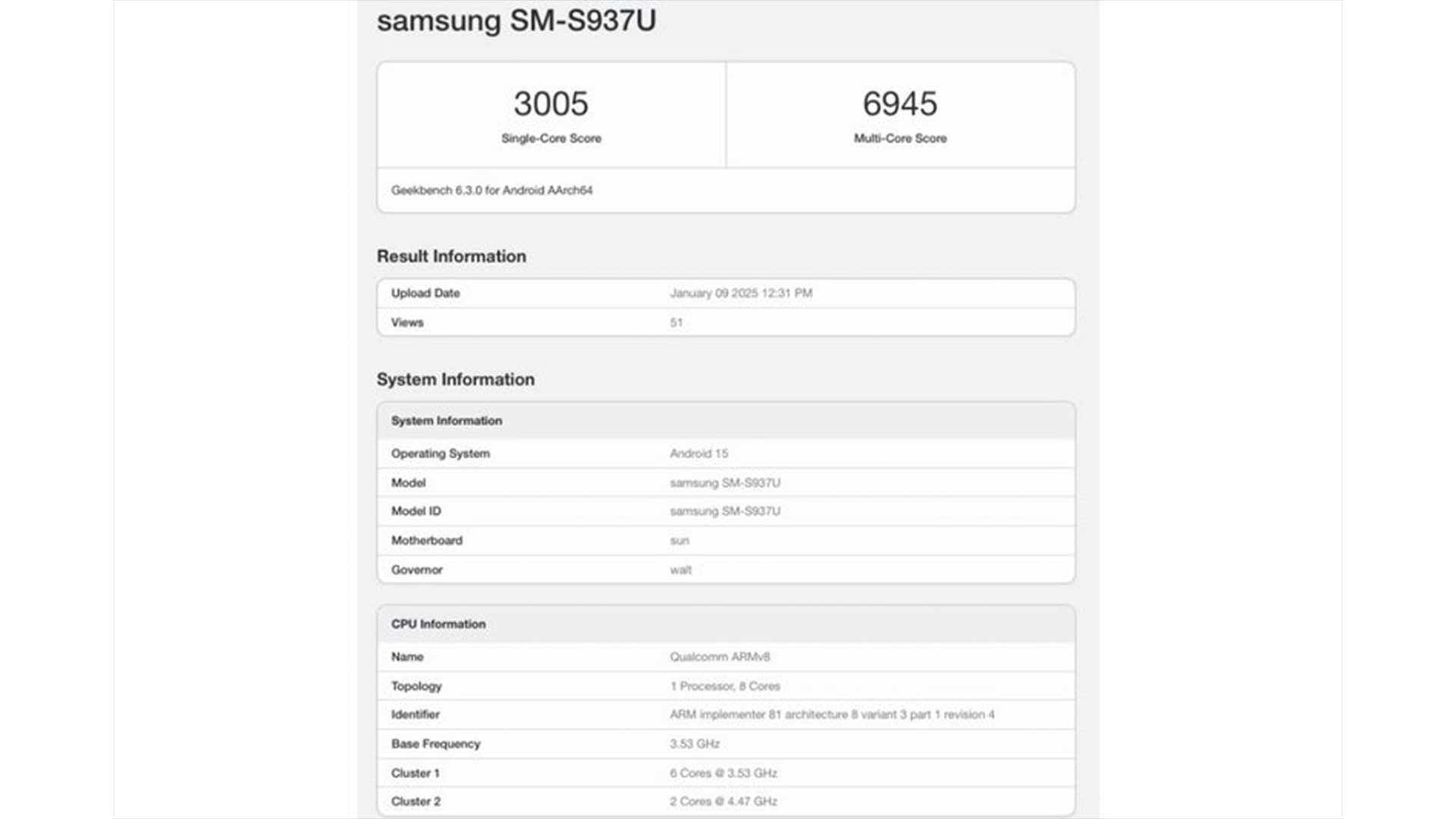 今回の情報によると「Galaxy S25 Slim」と思われるベンチマークがリークしたとしています。上記の画像からもマルチコアが「6945」とSnapdragon 8 Eliteを搭載していることを考えるとかなり低めです。