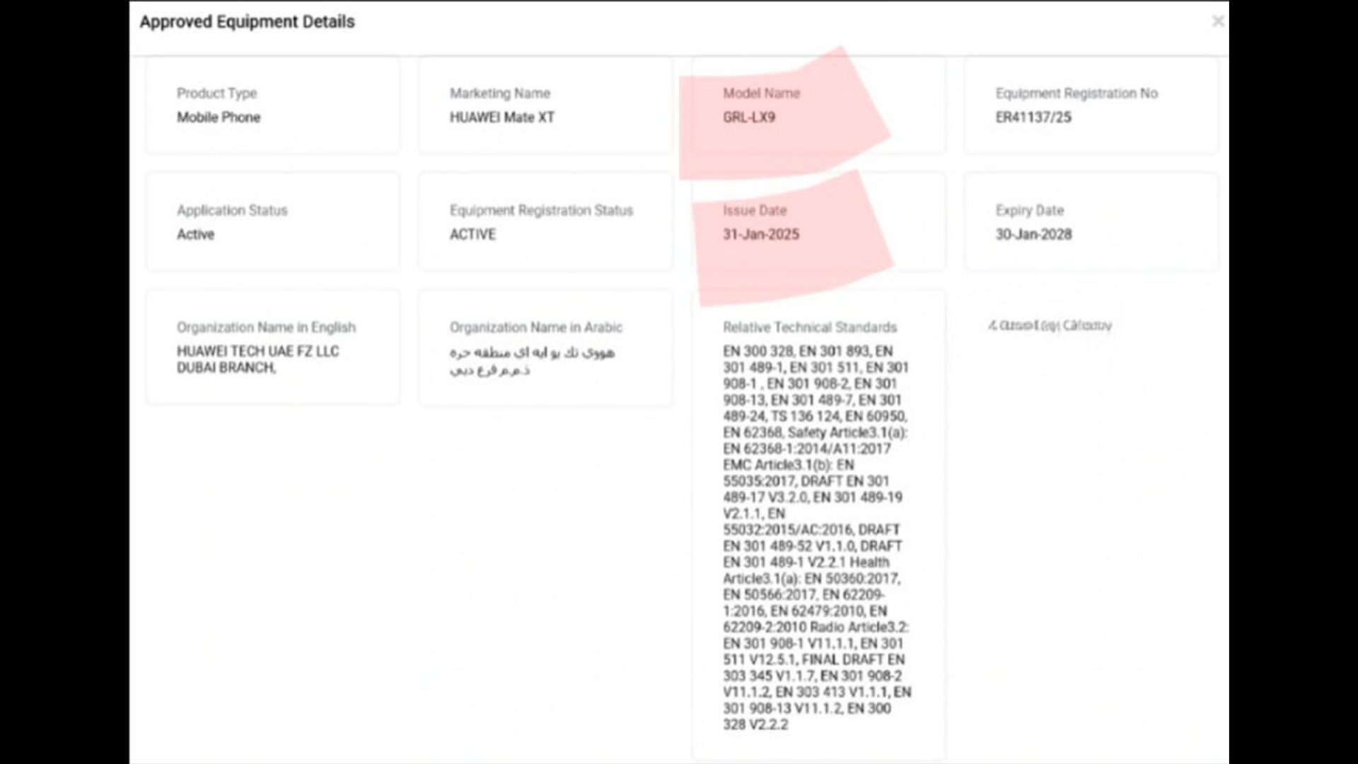 今回の情報によるとHuawei Mate XTがUAE TDRAの認証を通過していることが判明したとしています。ちなみに中国向けのモデル番号はGRL-AL10に対して今回認証を通過したのはGRL-LX9となっています。
