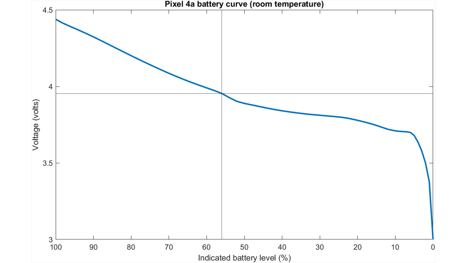 簡単な計算をすると、アップデート後の使用可能なバッテリー範囲が1.15 Vから0.65 Vに低下し、43%低下していることがわかります!ただし、上記のようにバッテリーは直線的ではないので、これはまだ全体像ではありませんが、ソフトウェアから元の電圧からパーセンテージ曲線をチェックして、3.95Vが何に対応するかを確認できます。
