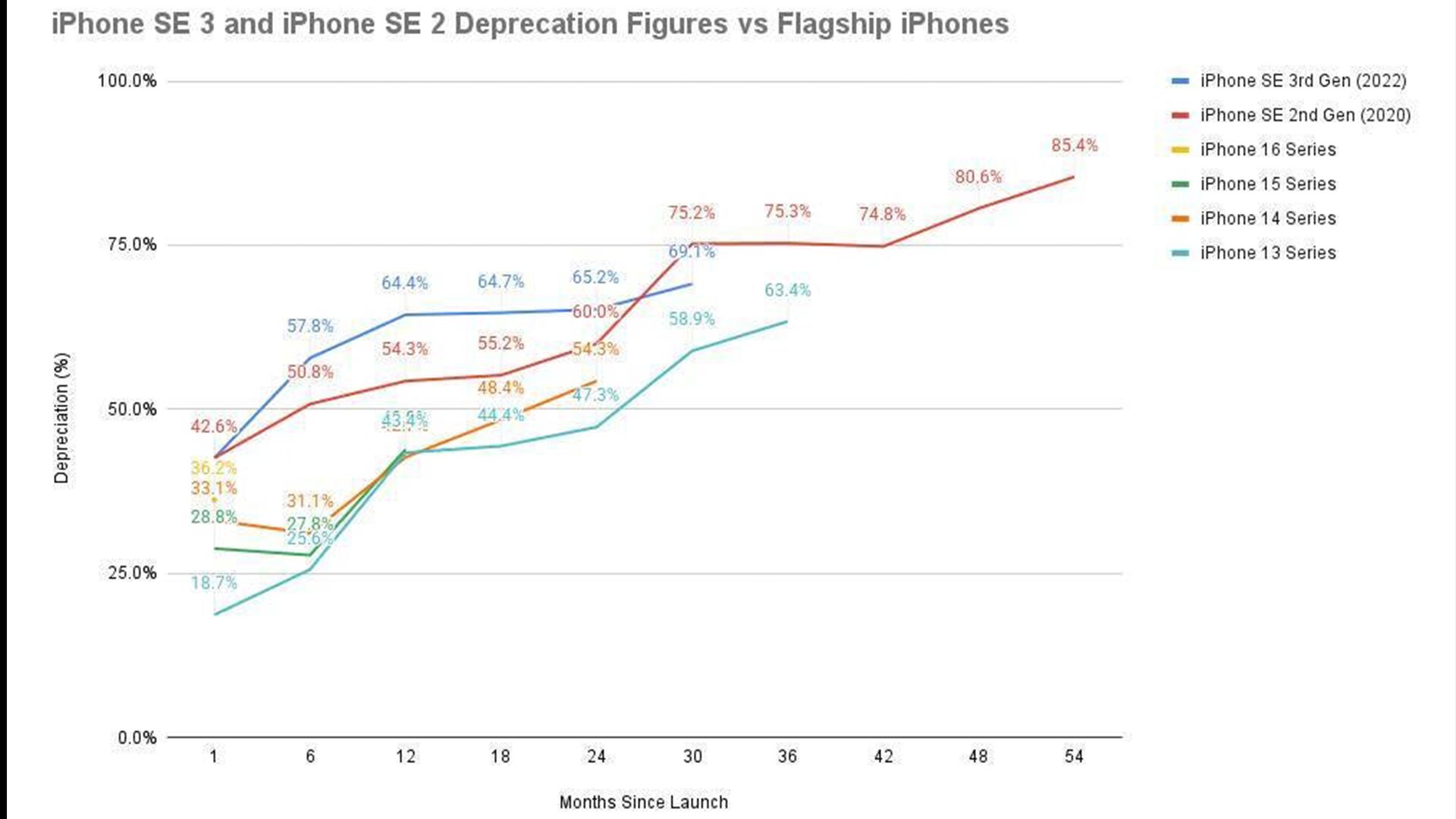 iPhone SEの価値保持率が低い理由は、Miniモデルの価値が優れていることを考えると、サイズが小さいことではありません。代わりに、予算モデルとしての位置づけ、低い開始価格、時代遅れの仕様とデザインにより、より早く減価償却されるようです。