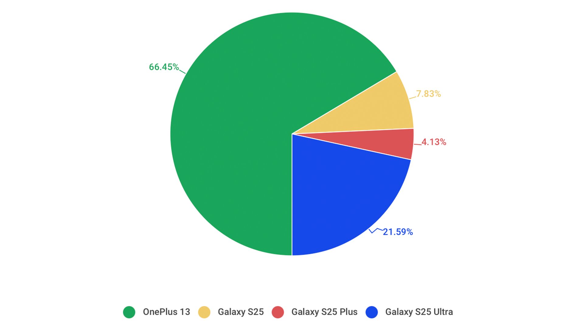 読者にOnePlus 13または他のS25モデル(Ultraだけでなく)を選択するかどうかを尋ね、OnePlusは再び大勝利を収めました。約5,000票が投じられ、回答者の3分の2近くがOnePlus 13を選びました。一方、回答者の約21.6%がS25 Ultraを選択し、約7.8%がベースS25を選択し、わずか約4.1%がS25 Plusを選択しました。