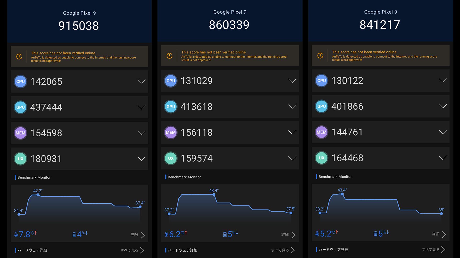 ちなみに最適化が終了していない状態でPixel 9のベンチマークを計測した時は100万点以下で内部温度も43度前後まで上がったのでPixel 9シリーズより発熱を抑制したチューニングを採用している可能性もあります。