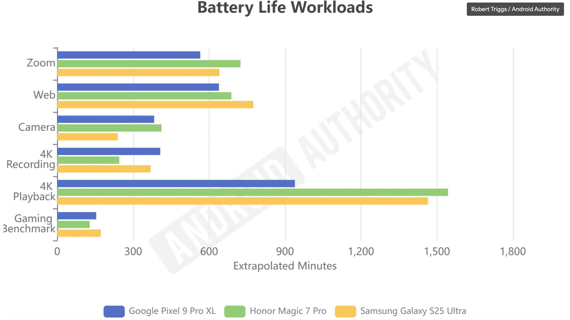 Pixel 9 Pro XLは5060mAhに対してGalaxy S25 Ultraは5000mAhと今回比較されている機種はほぼ5000mAhと同程度のバッテリー容量に対応しています。その上でテスト結果を見るとやはり電池持ちが全体的に劣るという印象です。