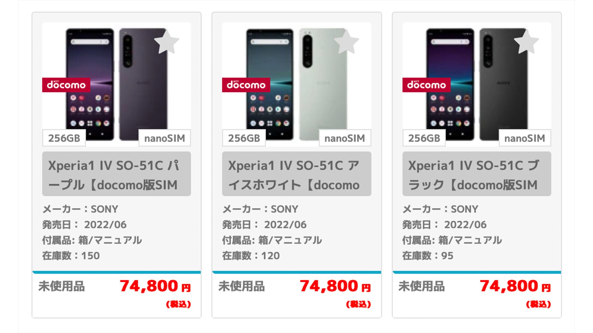 今回イオシスにおいてXperia 1Ⅳ/docomo版が7万4800円で販売されていることが判明しました。またポイントとしては「未使用品」となっていることで新品に近い状態なのは嬉しいところだと思います。