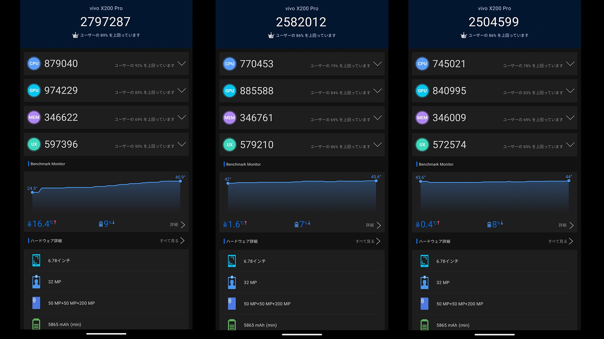 計測終了ごとに外部温度を計測したところvivo X200 Proは38.6/40.2/39.2度です。一方でvivo X300 Proは39.4/42.0/40.5度と負荷をかけた場合の発熱は感じやすいです。
