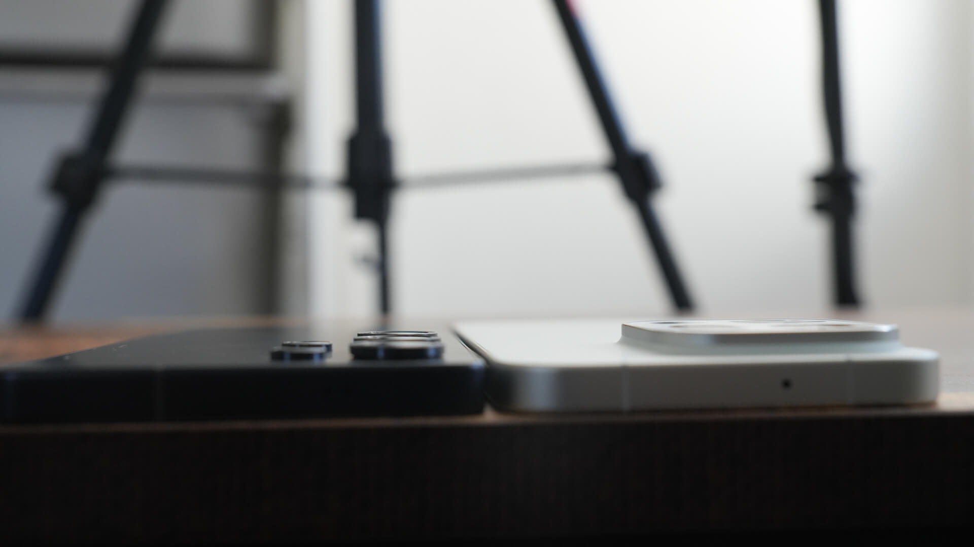 Galaxy S25 Ultraは垂直型を採用している上にカメラフレームもないのでかなりスッキリしている印象を受けますがテーブルに置いた時にかなりガタガタすることに加えマグネット対応アクセサリーを使う場合カメラデザインのせいで干渉することもあるのでデザインとしてはありだけど実用的ではないです。