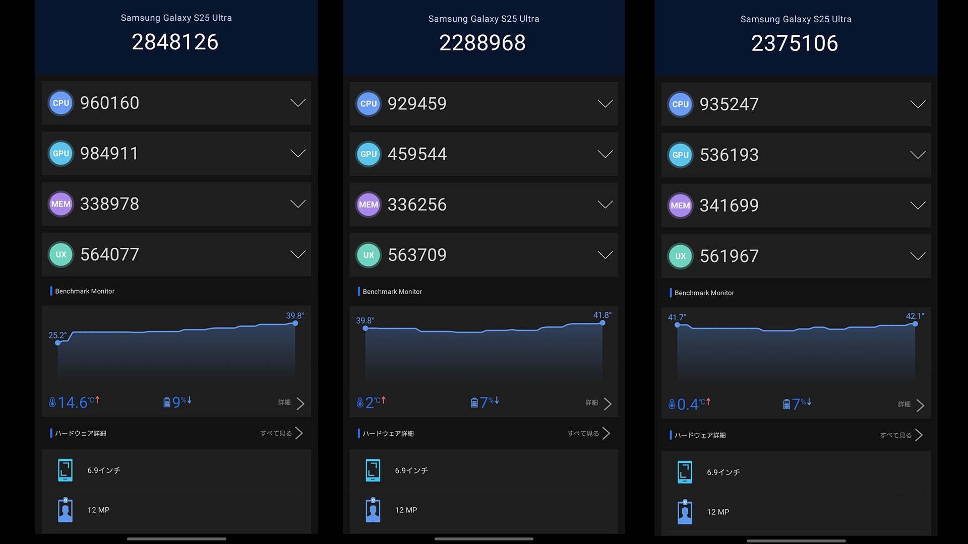 トップスコアで見ればGalaxy S25 Ultraの方がざっくり2倍ですが安定率は2分の1という感じです。ちなみに計測終了後に外部温度を計測してみるとGalaxy S25 Ultraは40.8度に対してOppo Find X9 Proは38.2度と長時間負荷をかける場合はOppo Find X9 Proの方が控えめの印象を受けます。