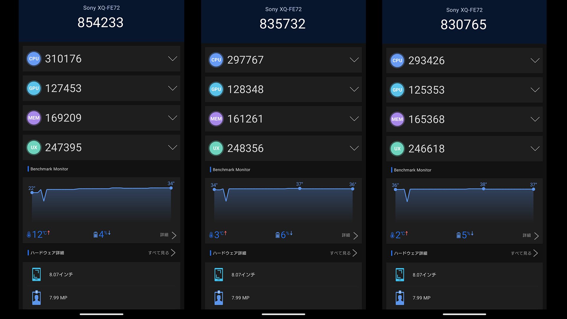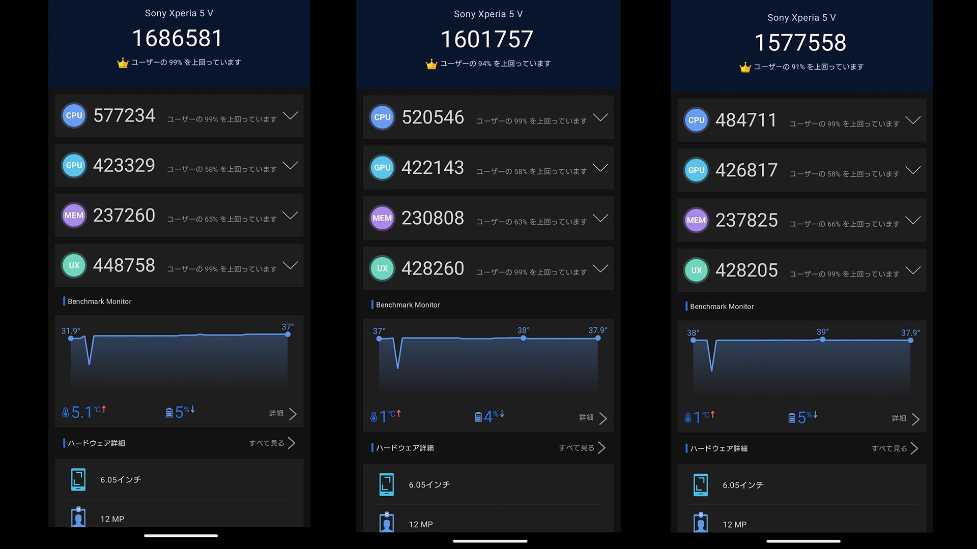 ちなみに計測終了ごとに外部温度を計測してみたところXperia 10Ⅶは30.2/30.7/34.2度でXperia 5Ⅴは33.2/34.6/34.5度と思っていたよりXperia 5Ⅴは発熱しなかったという印象です。