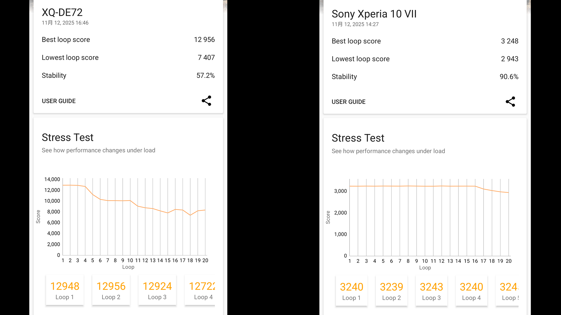 トップスコアでみればXperia 5Ⅴの方が4倍高いですが安定率で見ればXperia 10Ⅶの方が圧倒的に高いです。ただXperia 5ⅤのロースコアでさえXperia 10Ⅶのハイスコアの約2倍なのでかなり差のがあります。