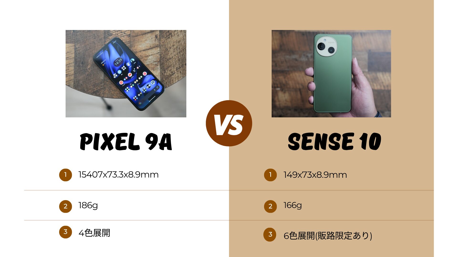 単純にカメラバンプでみれば気にするような差がなく単純にカメラデザインの好みで選ぶのがいいです。少しでもコンパクトに拘る人はAQUOS sense10がおすすめですが重さが気にならないならPixel 9aでも持ちやすさがそこまで変わるわけではないので店頭でチェックするのがおすすめです。