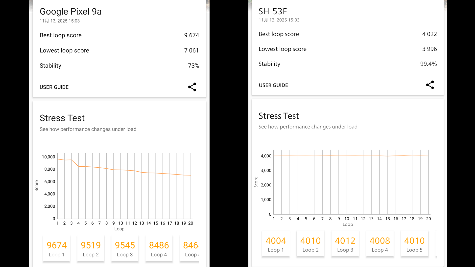 安定率で見るとAQUOS sense10の方が圧倒的ですがトップスコアでみるとPixel 9aが圧倒的です。単純にPixel 9aの方がパフォーマンスが高い分発熱しやすいから制御しているという感じです。