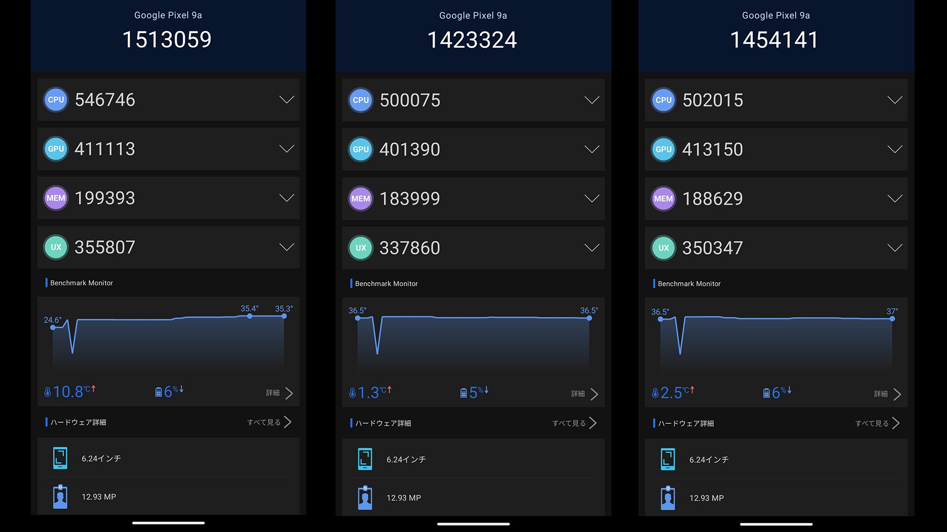 そして計測終了ごとに外部温度を計測したところPixel 9aは32.3/33.5/33.5度に対してAQUOS sense10は28.0/28.4/29.4度と発熱がかなり抑制されているのが地味に驚きです。