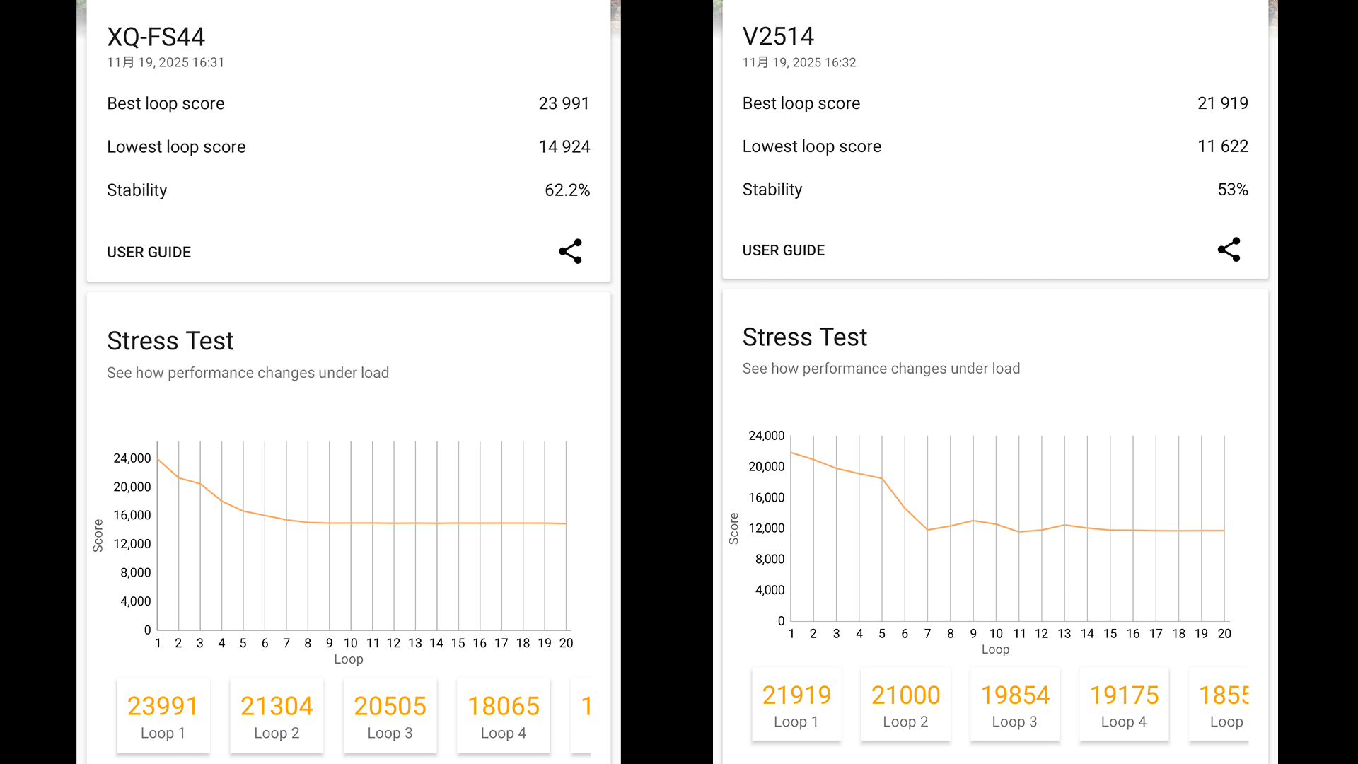 メーカーごとに何か設定しているのか不明ですがXperia 1Ⅶの方がトップスコアもロースコアも高いのに安定率も優秀とこれだけをみるとDimensity9500はかなり不安定に感じてしまいます。