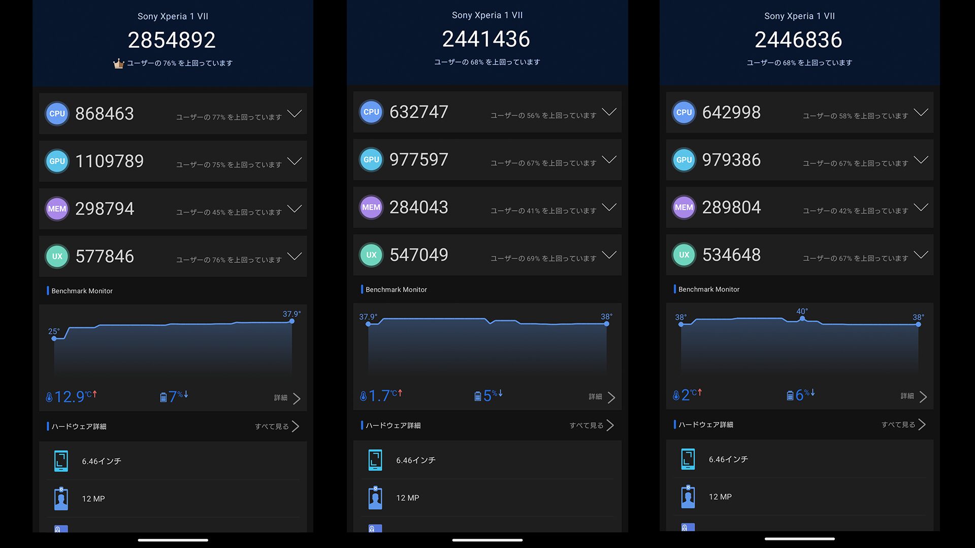 そして発熱の程度を調べるためにベンチマークを連続で3回回して負荷をかけてみました。流石にトップスコアはvivo X300 Proの方が上ですがXperia 1Ⅶで280万点もいくのが個人的に衝撃的です。
