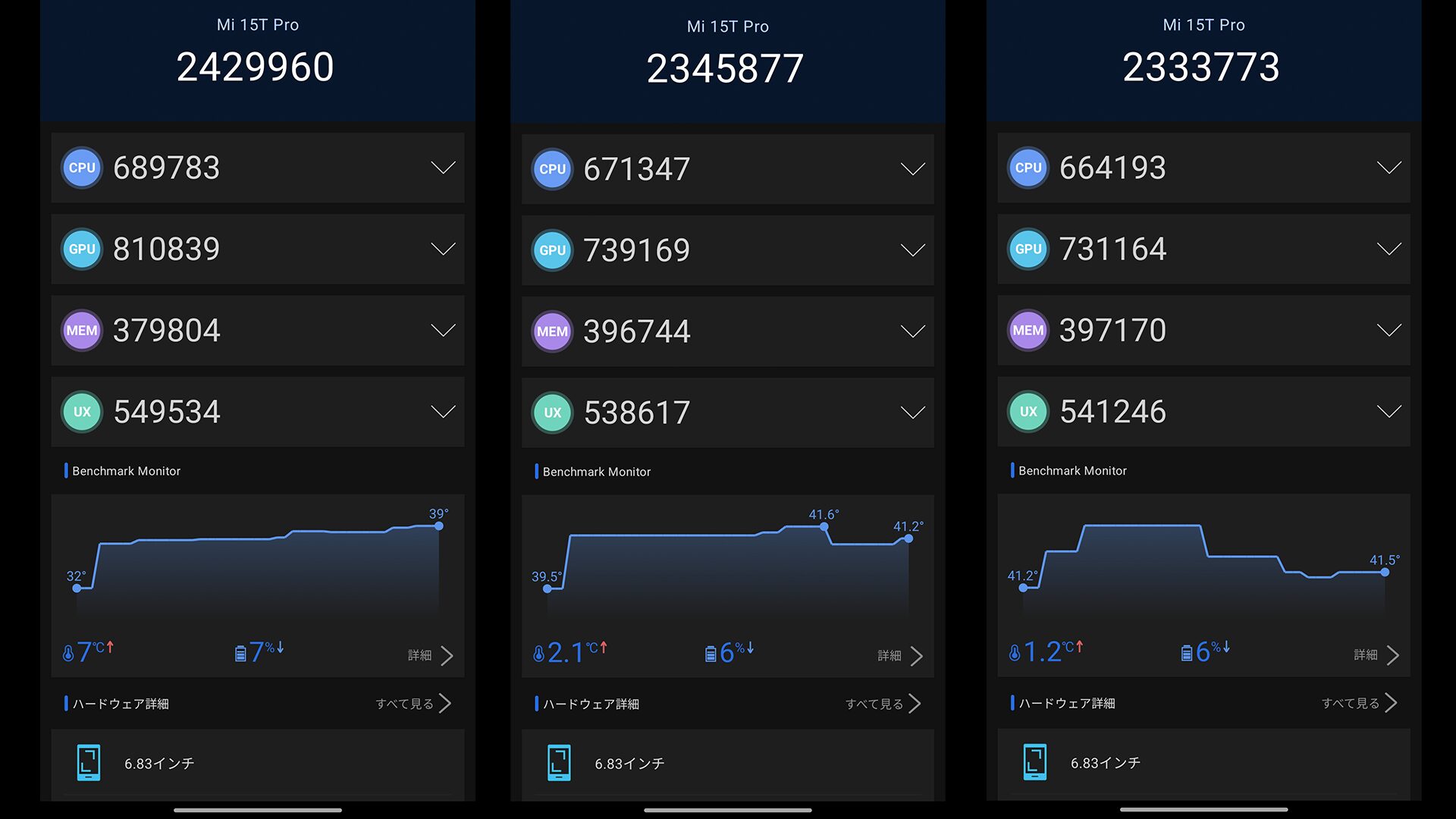 改めてこの世代のDimensityはSnapdragon対比でバランス重視で発熱もしにくい印象です。計測終了ごとに外部温度を計測したところXiaomi 15 Ultraは36.5/42.0/43.2度でXiaomi 15T Proは38.5/42.9/39.0度と実際に持ち比べても発熱に明確な差があります。