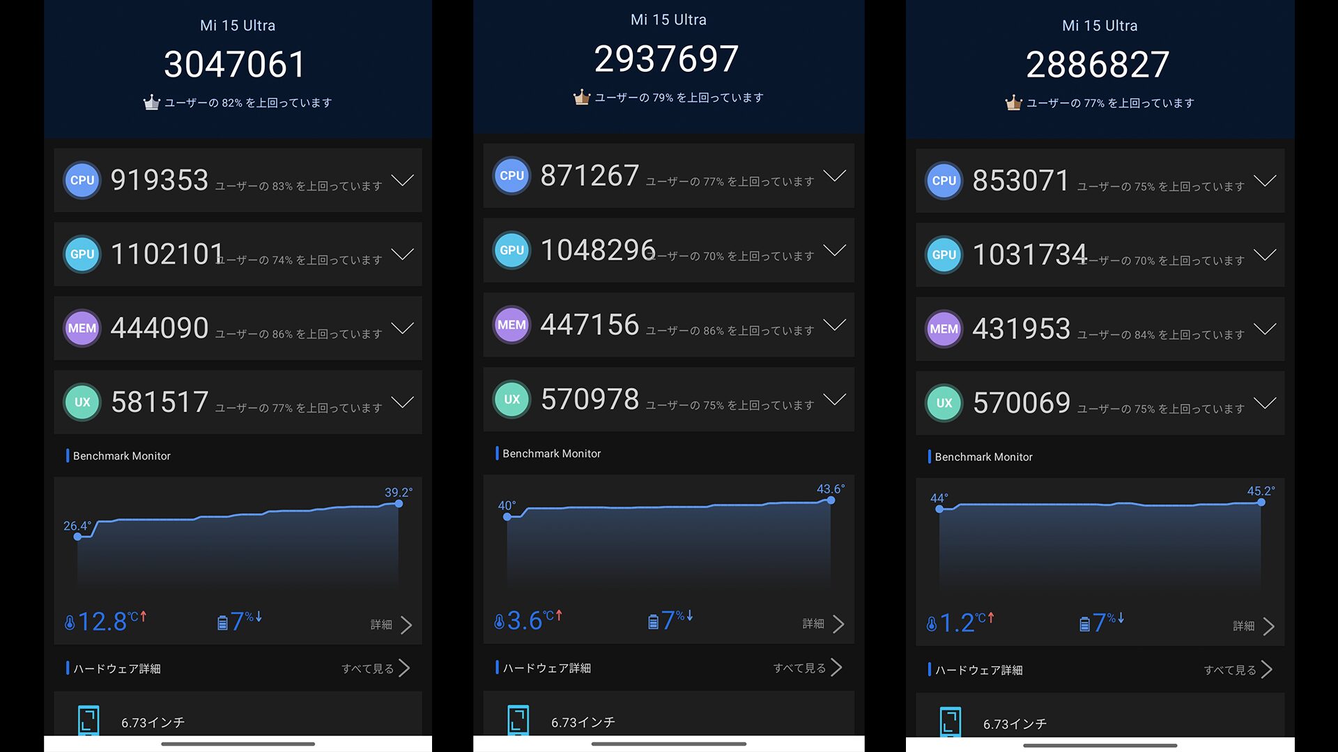 とはいってもXiaomi 15 Ultraは18周目に発熱が原因で強制終了になった感じです。ちなみに以前は13周目あたりで強制終了になっていたのでこちらも以前よりは改善しています。